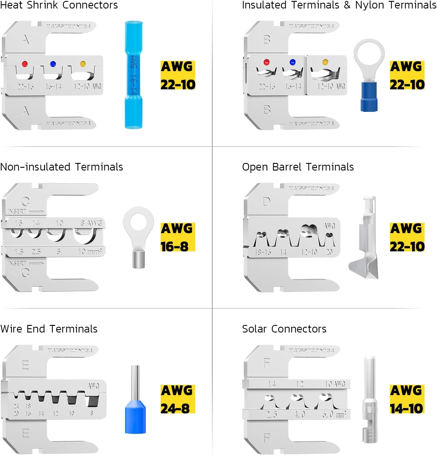 Versatility at Its Best: The crimping tool set is designed to meet all your crimping needs. With 6 types of crimping dies you can confidently tackle various connectors, including heat shrink connectors, insulated connectors,non-insulated connectors, open barrel connectors, wire end terminals, and female/male terminals & solar connectors. 1*Automatic wire stripper tool. One toolset to rule them all