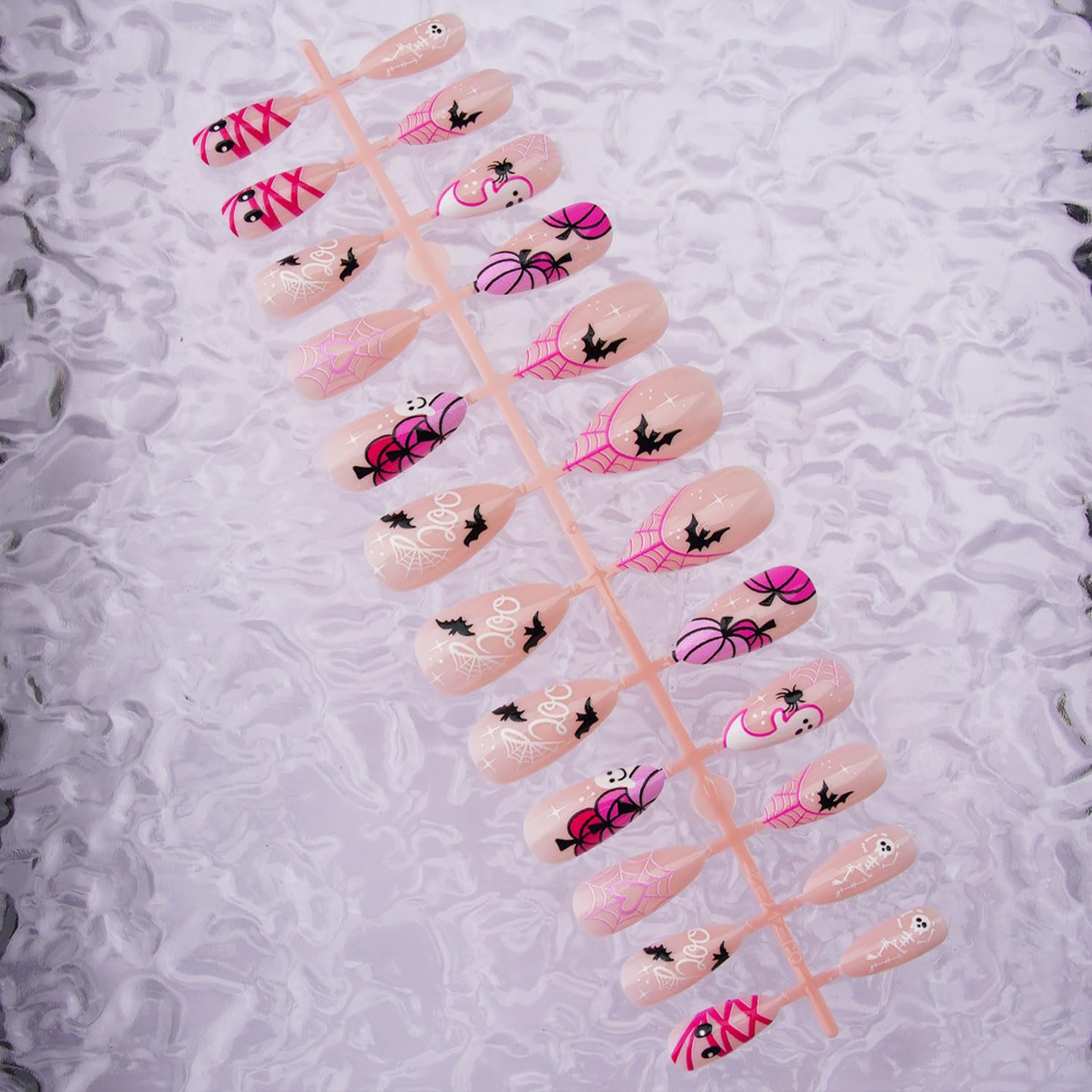 Halloween Press on Nails Short Almond Pink Fake Nails with Ghost Spider & Bat Designs Acrylic Nails Press ons Cute Full Cover Halloween Stick on Nails for Women 24Pcs