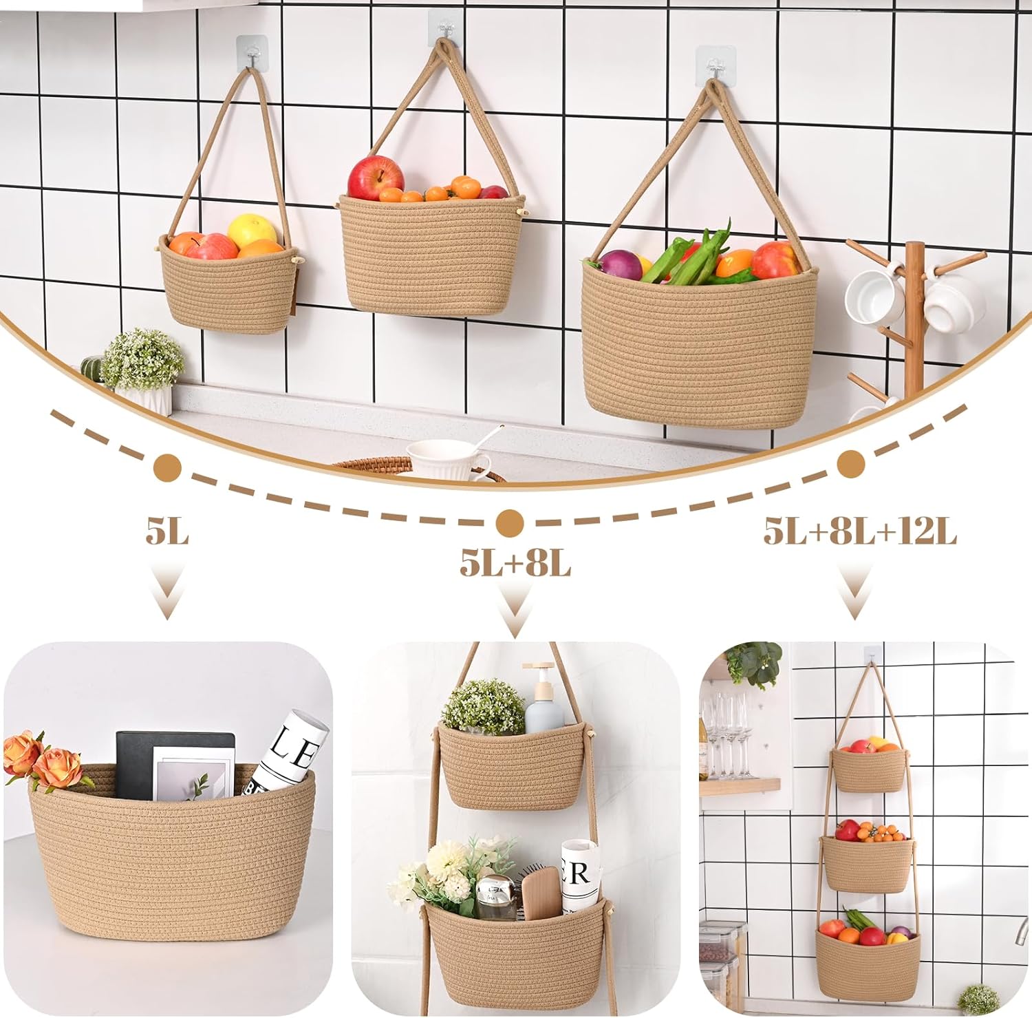🌈HEAVY-DUTY & 3-Tier Hanging Basket: Crafted from hand-made woven cotton, this hanging basket in 3 different sizes is LOAD-BEARING, BUILD QUAILTY and AMPLE ENOUGH for your hanging ability of home organizing.