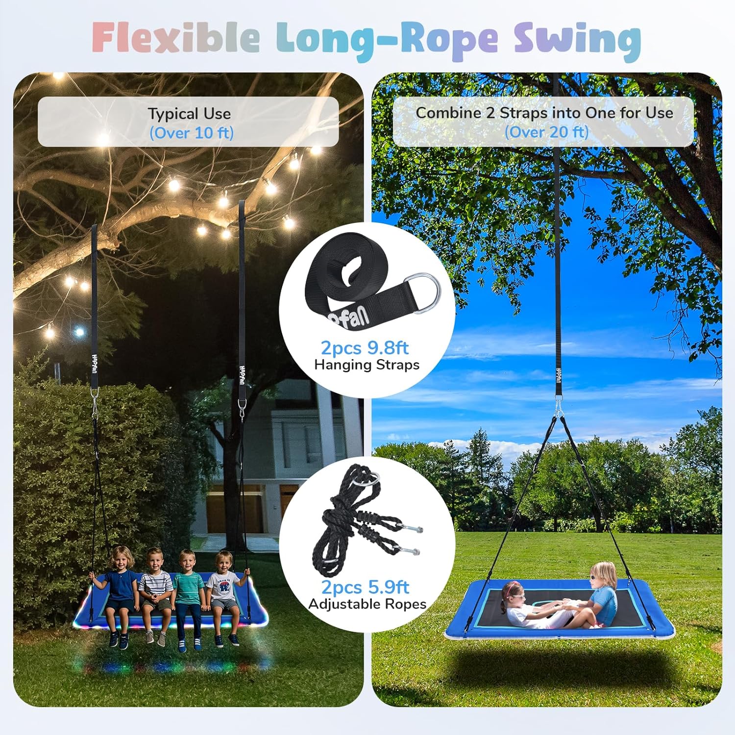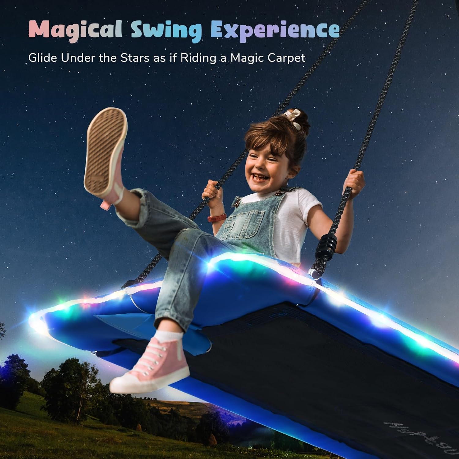 【Magic Carpet LED Light Swing】Featuring 8 flashing modes, the rectangle platform swing transforms outdoor play into a magical adventure for kids. Create unforgettable moments with vibrant lighting that fits any occasion