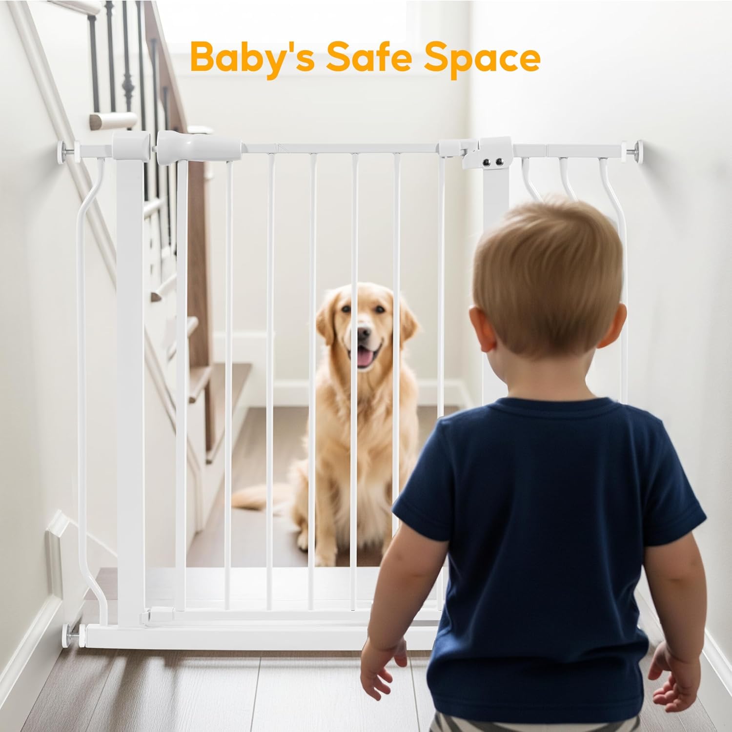 Durable and Sturdy: Baby gate for stairs no drilling is made of steel, this gate can withstand impacts of up to200lbs, ensuring it won’t budge; It’s perfect for families with children and pets