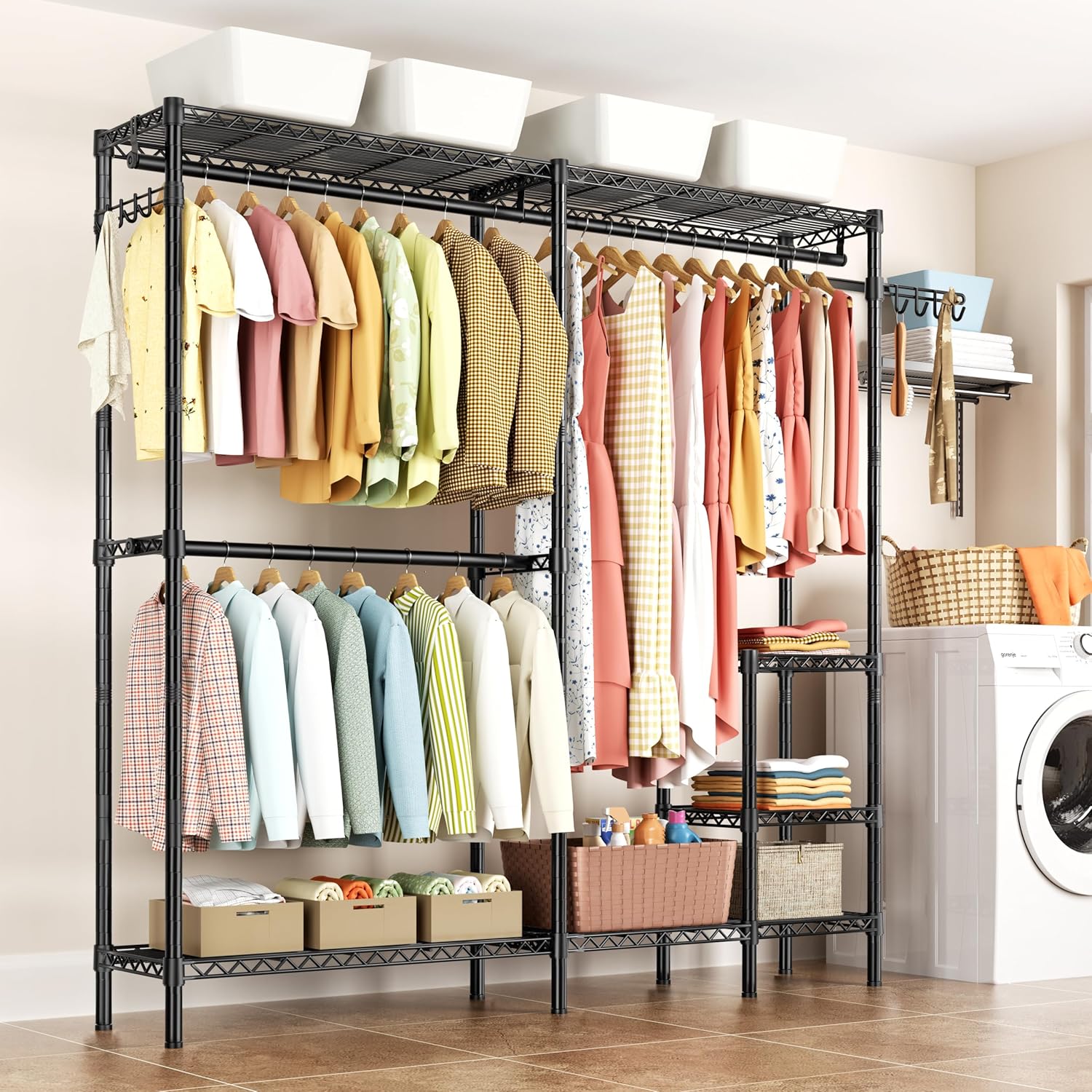 Versatile Multifunctional Clothes Rack: Unlock the full potential of our durable garment rack featuring 3 hanging rods and 4 tiers of adjustable wire shelving and 2 side hooks! Hang suits, coats, pants, shirts, or heavy clothes in various configurations to suit your preference. Designed for convenience and versatility, this rack enhances your storage options, making it perfect for a variety of clothing and accessories