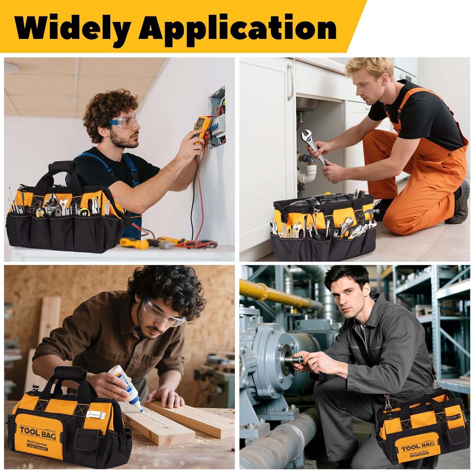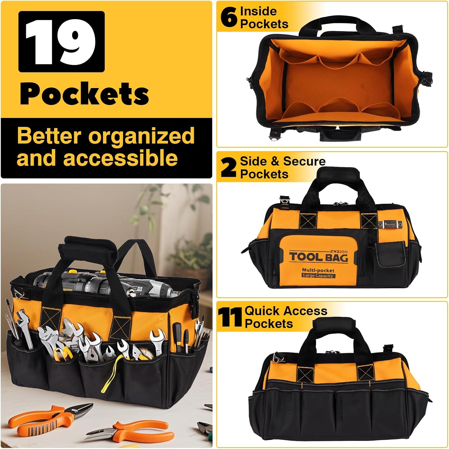 Heavy Duty Tool Bag 16-Inch with 19 Pockets, Thickened Fabric Tool Box Organizer Storage with Large Zipper, Tool Bags for Men, Portable Toolbox (Black, Yellow wtih”Tool Bag”)