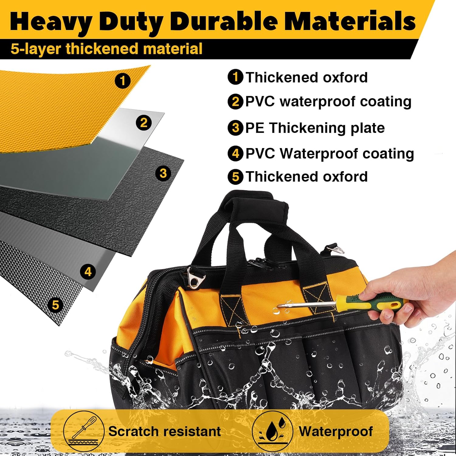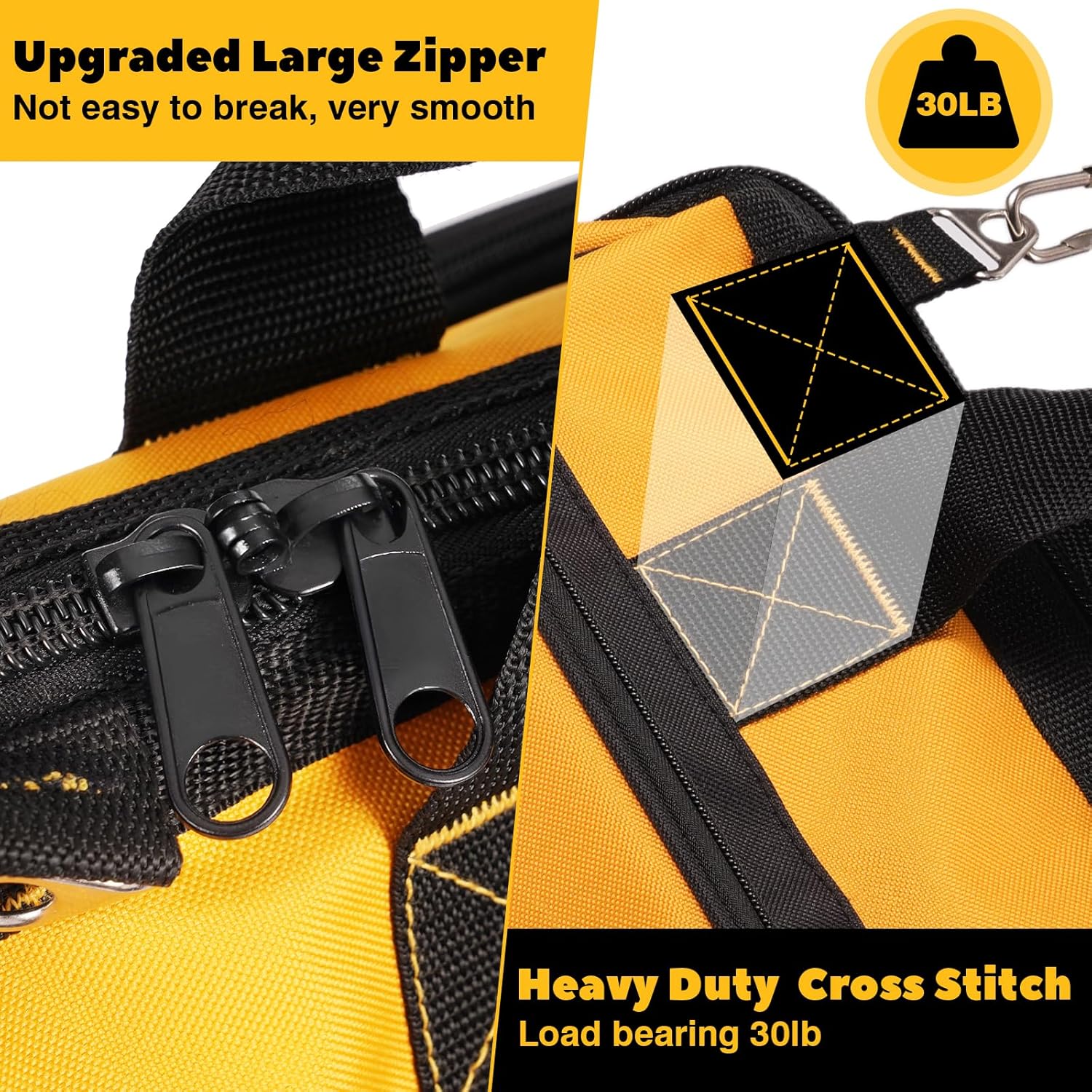 【High Quality Materials】 This tool box features an upgraded metal large zipper with wear-resistant coating, ensuring exceptional durability and resistance to breakage. Crafted from premium 5-layer woven fabric for enhanced abrasion resistance, it includes a reinforced base with anti-slip design for reliable use in all weather conditions.