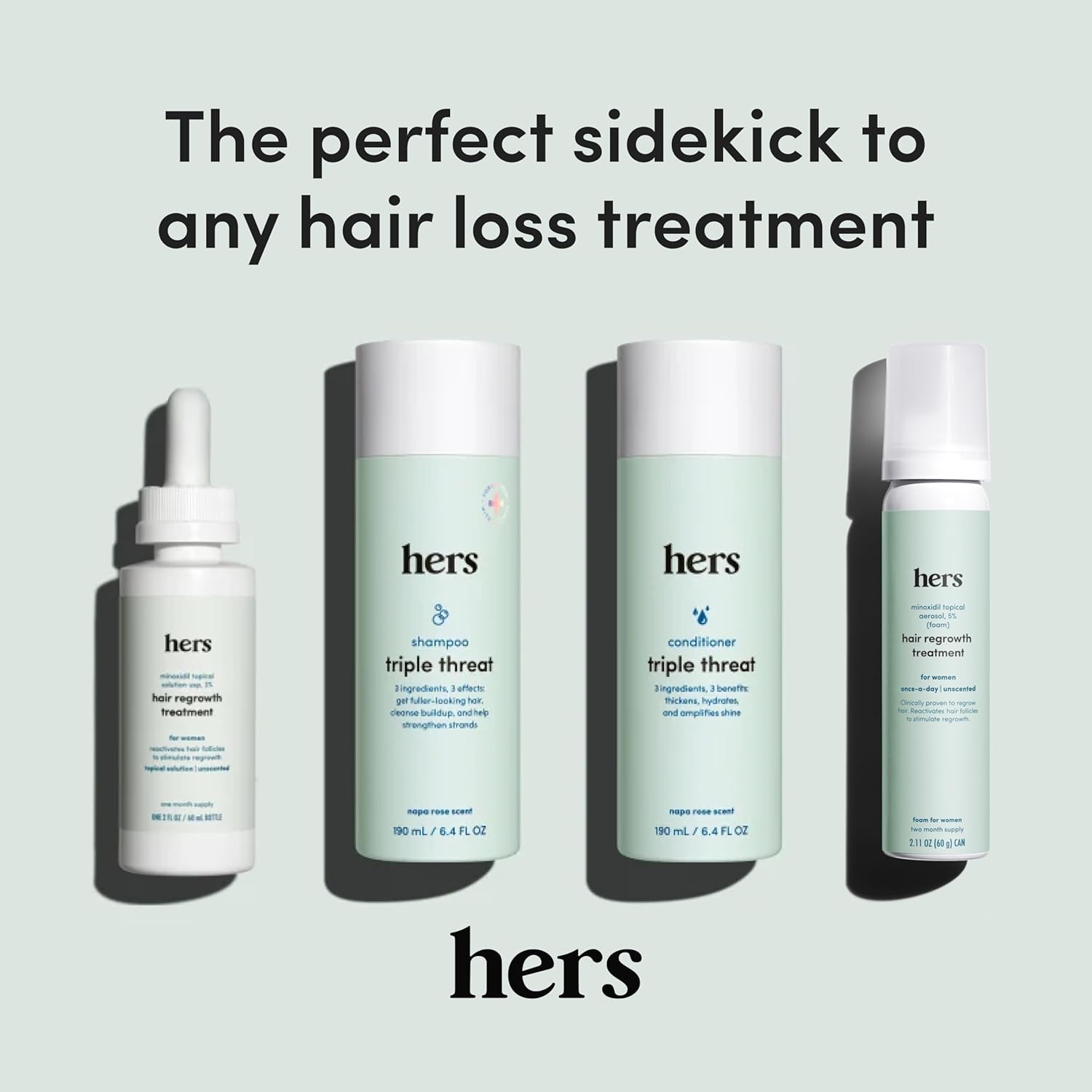 hers Triple Threat shampoo helps control hair shedding by strengthening and moisturizing hair with biotin, saw palmetto, and pumpkin seed oil