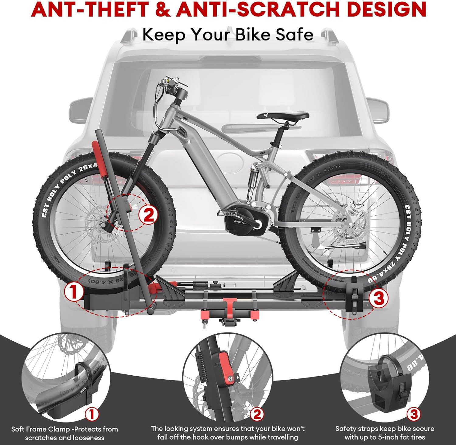 Dual-Layer Anti-Theft Protection – Our ebike hitch rack is equipped with a robust heavy-duty trailer hitch lock and dual-arm locking system, which provides superior stability and theft deterrence. Once locked, the arms stay firmly in place, the locking hitch pin ensures both your ebike and hitch bike rack stay securely in place,preventing unauthorized removal or movement