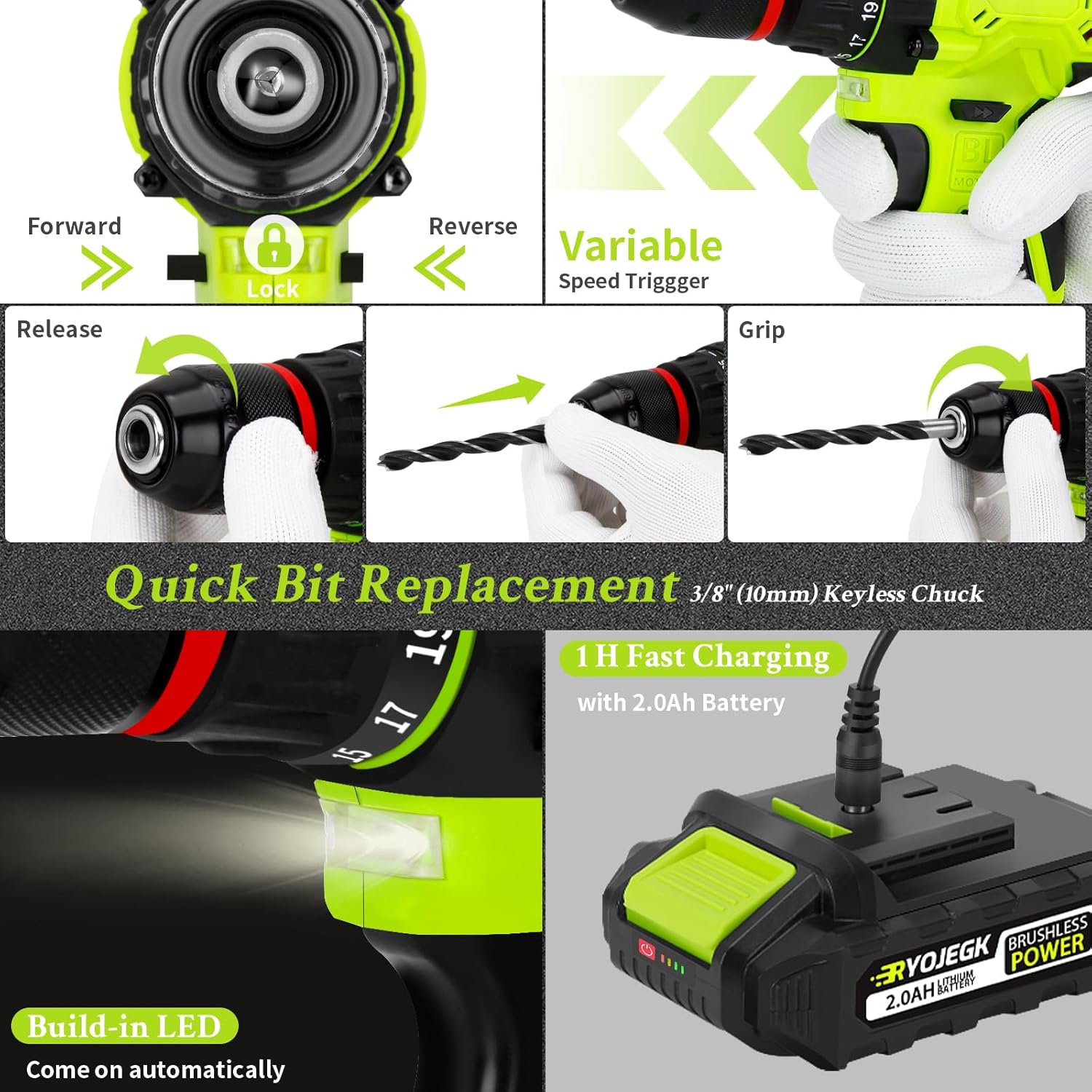 GOOD FAMILY HELPER – The RYOJEGK drill set not only comes with a 20V brushless drill, but also comes with an extensive 115-piece tool kit, including hammers, saws, wrenches, pliers and tape measures, etc. Whether you’re assembling furniture, repairing appliances, or doing simple home improvements, this 119-piece home battery drill kit is designed to provide you with the solutions you need