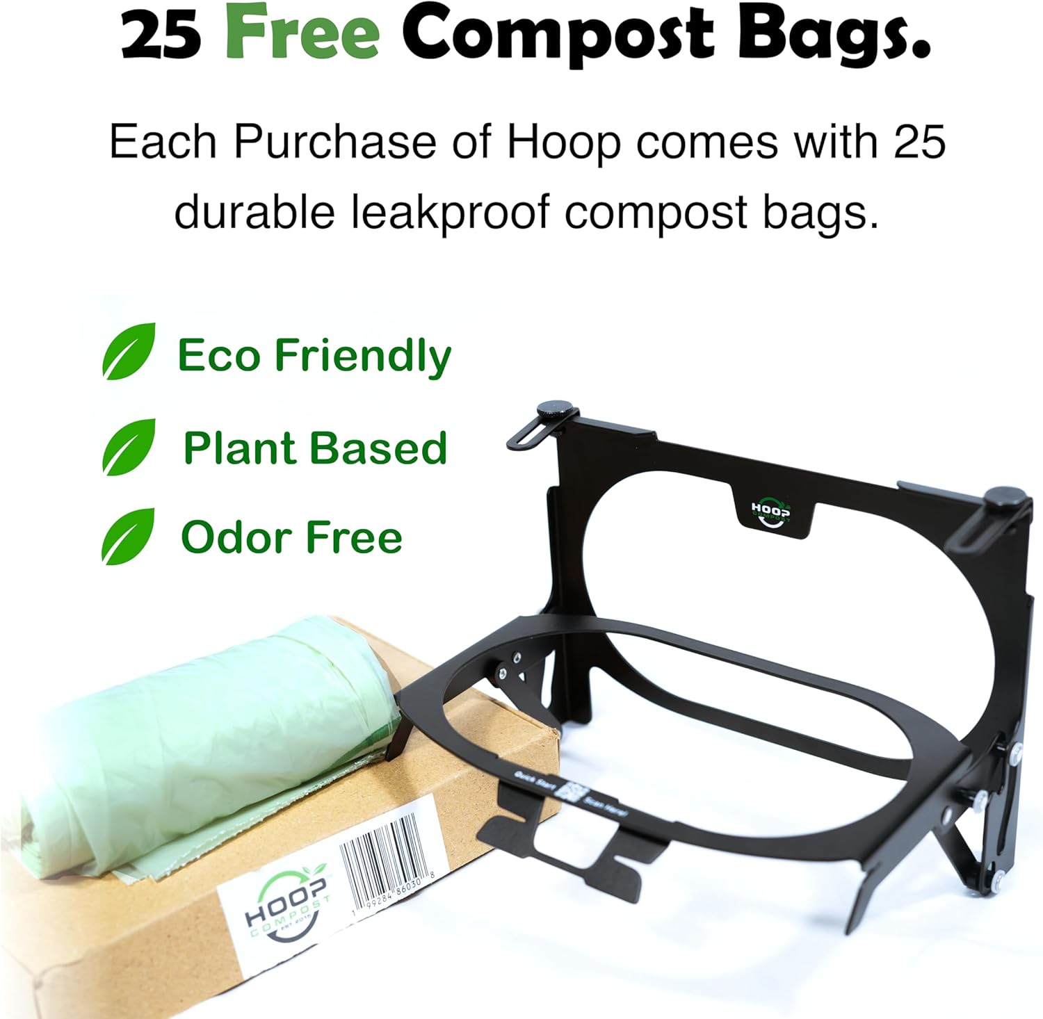 Hoop Metal Compost Bag Holder + 25 Compost Bags 3 Gallon, Clips to Kitchen Trash Can, Kitchen Cabinet Door, Replaces Countertop Compost Bin, Hanging Trash Can.