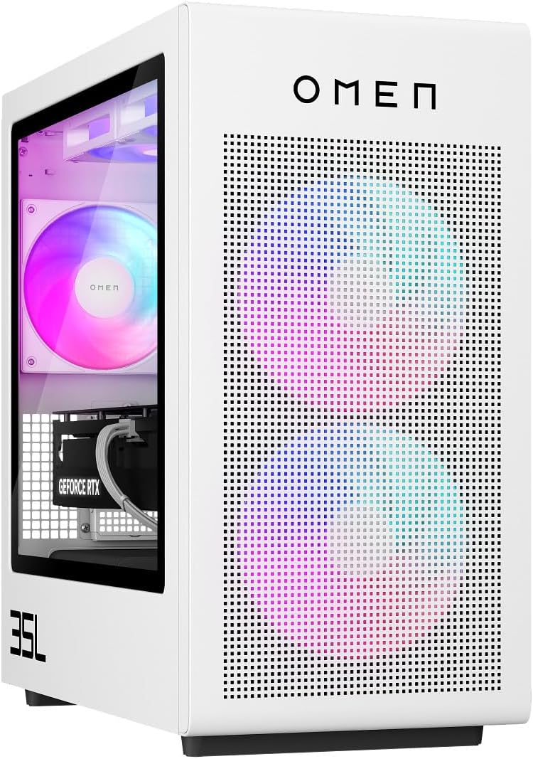 HP OMEN 35L Gaming 16-0077m Desktop PC, AMD Ryzen 5 8500G, GeForce RTX 4070 Super (12GB GDDR6), 32GB DDR5 Ram, 512GB PCIe SSD, Windows 11 Home – White (Renewed)