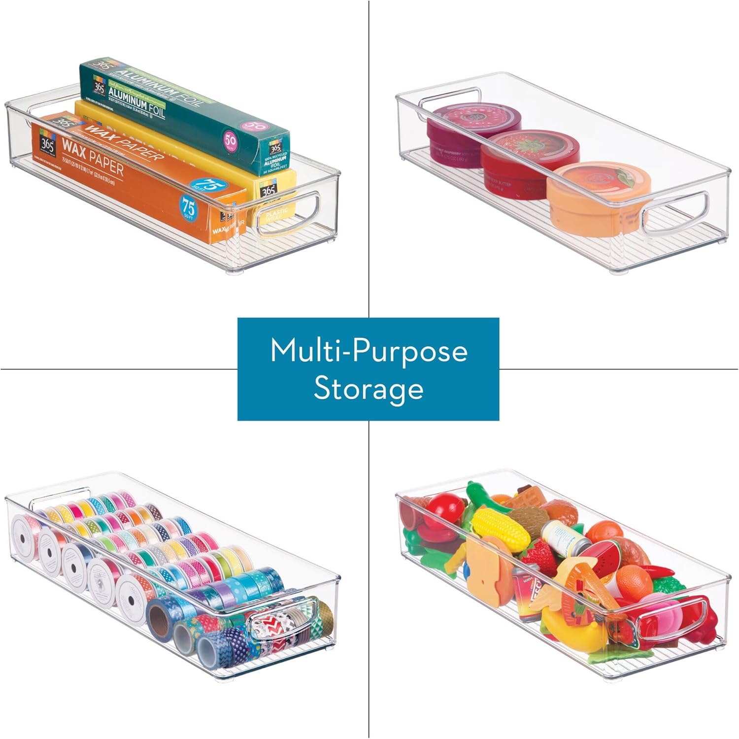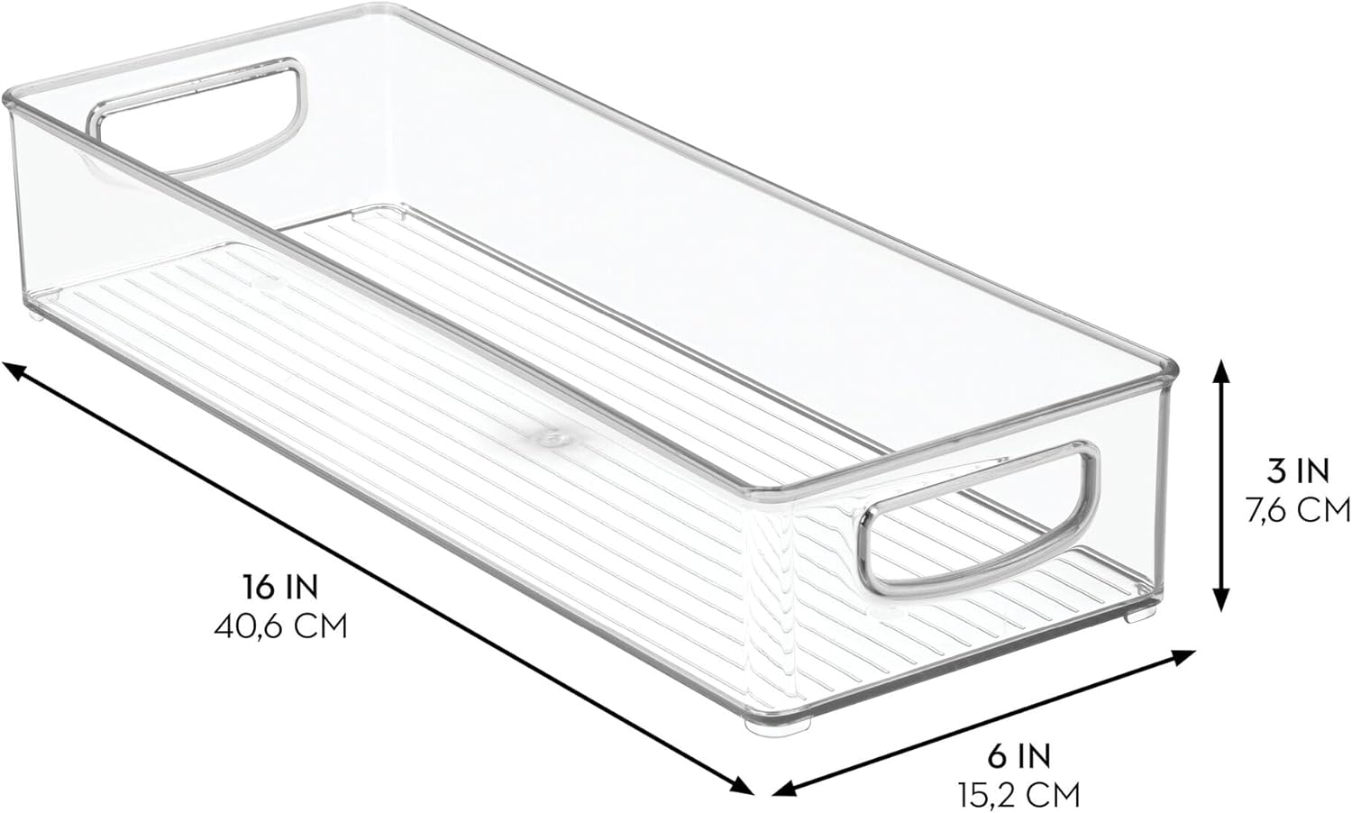 Upgrade your kitchen organization and storage with the iDesign Plastic Kitchen Storage and Fridge Organizer Bin. It’s a quick and easy addition to your pantry, cabinet, fridge, or freezer that will bring functional beauty and organized style. The versatile clear storage bin is ideal for use in the fridge and freezer to store produce, meat, cheese, drink boxes, food packets, potatoes, apples, onions, and more, or to store dry goods in the pantry and cabinet. Easily access or reorganize your items with the integrated handles on this fridge bin. The transparent design of the clear organizing bins ensures items are always visible and accessible. Measuring 16″ x 6″ x 3″, the food storage container is just the right size to store food in your fridge, freezer, pantry, or cabinet. Use several as clear storage bins to store kitchen utensils and tools, cleaning supplies, cosmetics, and crafts, or for extra organization in your closet or laundry room. Made with durable BPA-free clear plastic, this kitchen storage container stands up to everyday use. With iDesign, you can live simply and sustainably every day.
