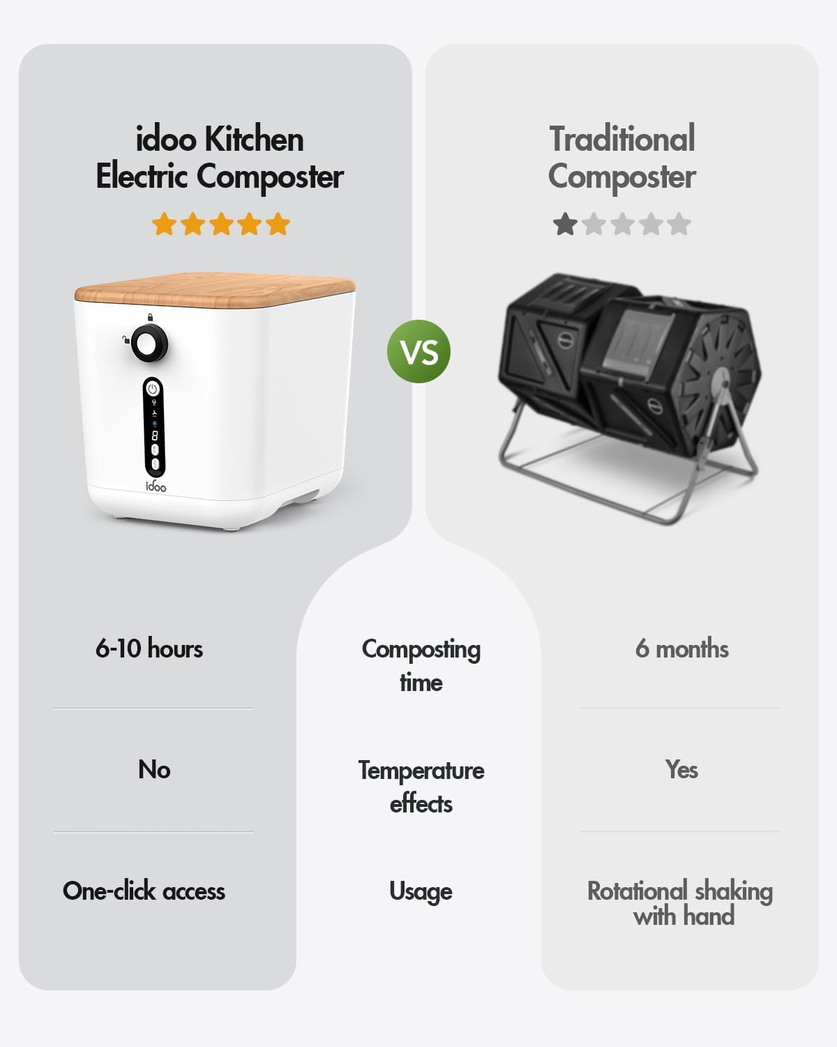 [Odorless] Upgraded Carbon Filter of iDOO food cycler machine have an higher odour-absorbing capacity. Compared to traditional composting bins, iDOO composting machine filters the odor produced by the food waste through the carbon filter into odourless, which do not attract insects; Operate with single button and does not require any effort to stir up the waste; composting is possible even in winter!