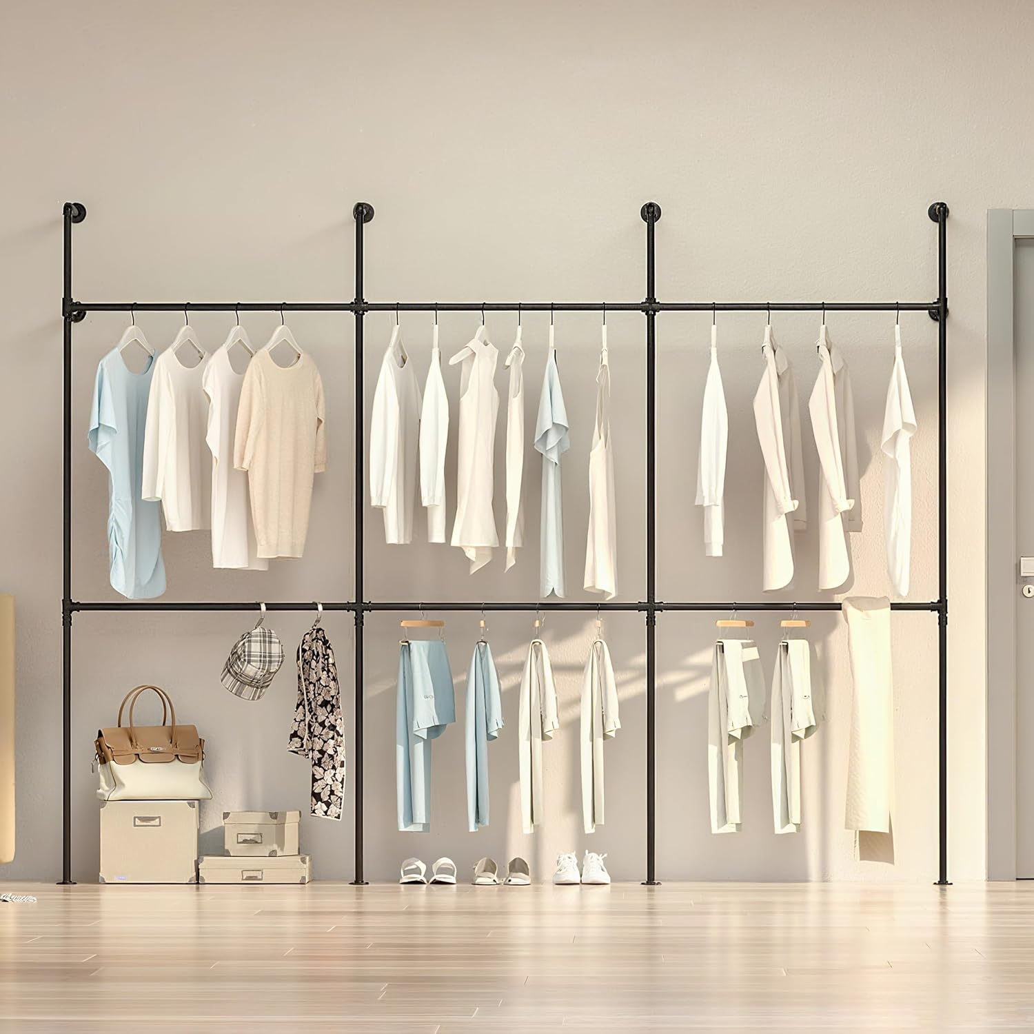Rust-Resistant Metal Framework & Wall-Mounted Stability​​: Crafted from 1.5-inch diameter galvanized steel pipes and triple-welded joints, the rack resists corrosion and withstands 150 lbs per hanging rod. The wall-mounted design eliminates tipping risks, while the tapered pipe ends and reinforced mounting brackets ensure secure attachment to concrete, brick, or wood surfaces, making it ideal for high-traffic closets, retail displays, or entryway storage.