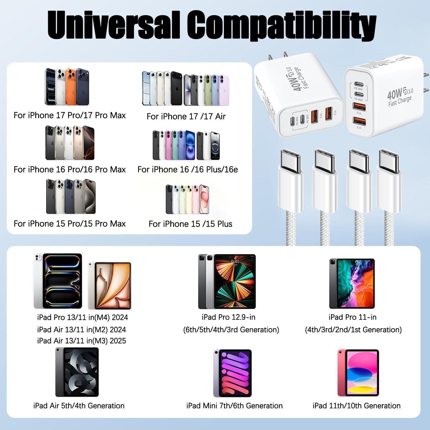 【Universal Compatibility】4in1 multiport fast plug wall charger block with usb c cable is compatible with iPhone 17/iPhone 17 Pro/iPhone 17 Pro Max/iPhone Air/iPhone 16/iPhone 16e/iPhone 16 Plus/iPhone 16 Pro/iPhone 16 Pro Max/iPhone 15 Pro Max/iPhone 15 Pro/15 Plus, iPad Pro 11/13 inch(M4), iPad Pro 12.9 inch 6th/5th/4th/3rd Gen, iPad Pro 11 inch 4th/3rd/2nd/1st Gen, iPad Air M3/6th/5th/4th Gen, iPad 11th/10th Gen, iPad Mini 7th/6th Gen and more usb c devices.