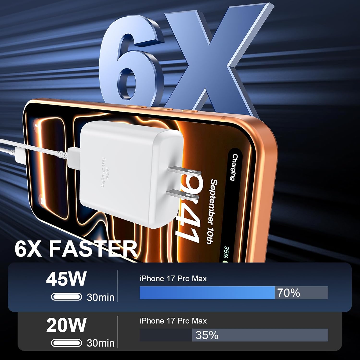 【45W iPhone 17 16 Pro Max Charger Fast Charging】:The 45W iPhone 17 16 Fast Charger USB C Block with 10ft extra long USB C to USB C fast charger cable cord provide Max 45W output power, charge your iPhone 17 16 Pro Max up to 70% in just 30mins, 6X faster than the original 20W USB C charger