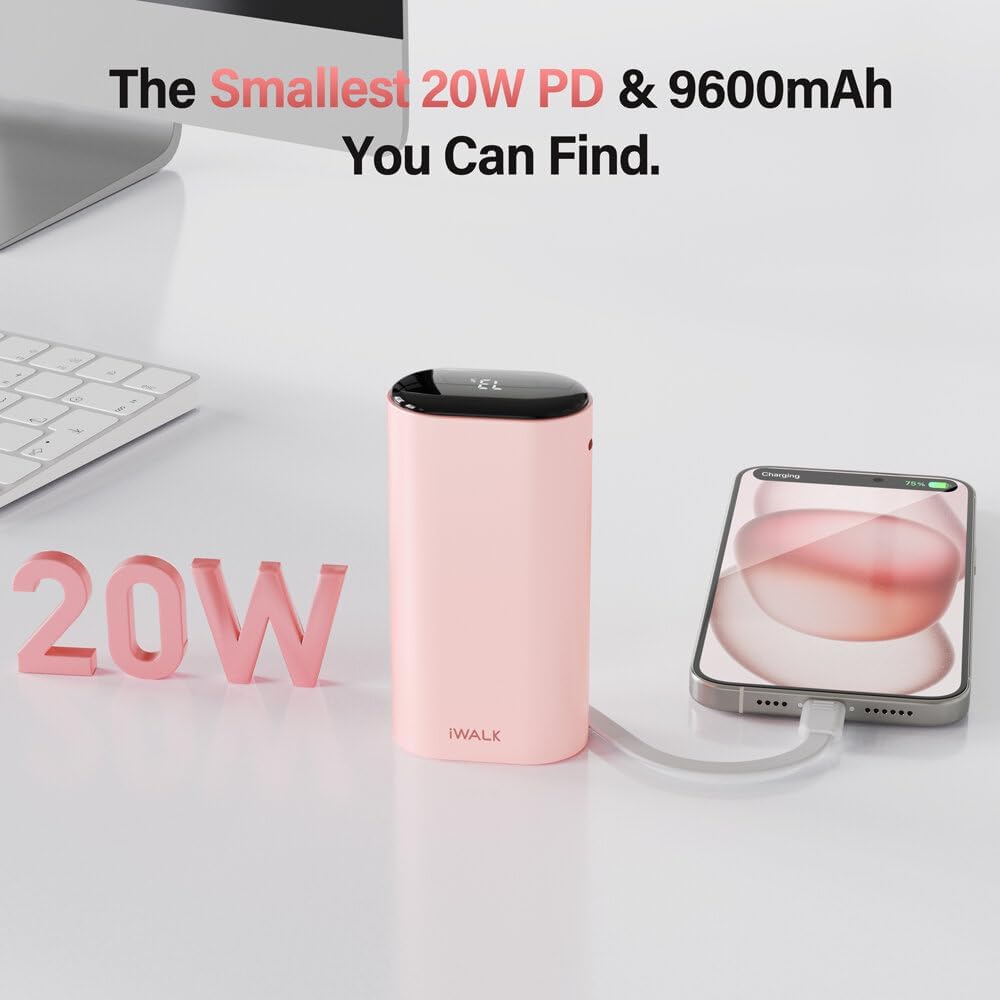 iWALK Portable Charger Fast Charging – 9600mAh 20W PD Power Bank with Built-in USB-C Cable, External Battery Pack for iPhone 15/15 Plus/15 Pro/15 Pro Max, Samsung, Android, iPad Pro/Air, AirPods