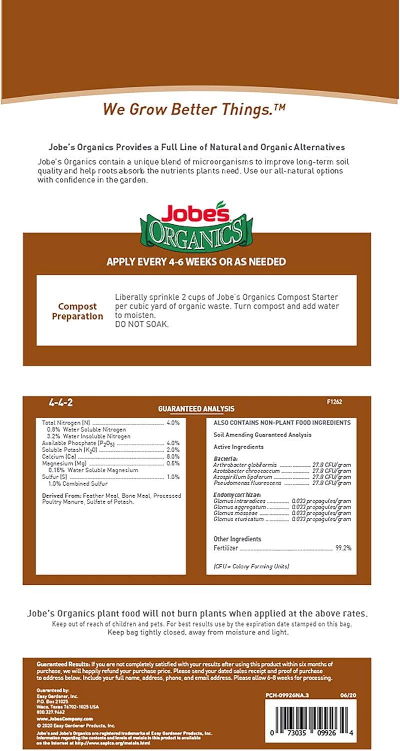 Jobes Organics Granular Compost Starter (4-4-2) is specially formulated to promote fast composting. The first fast-acting organic fertilizer for results you can really see. Jobes Organics Granular Fertilizers with Jobe’s Biozome is a new and unique family of 100% organic fertilizer formulas. The secret is in Jobe’s Biozome, a consortium of three microorganisms – bacteria, mycorrhizal fungi plus a unique species of Archaea – an extremely aggressive microorganism that quickly breaks down even complex materials and minerals into basic nutrients and trace elements that plants can readily absorb. With Jobes Organics you will see results faster. Size: 4 lbs Analysis: 4-4-2 Promotes fast composting Increases microbial activity Helps break down organic matter Contains 100% organic compost nutrients Made in the USA. Application Rate: Liberally sprinkle 2 cups of Jobe’s Organics Compost Starter per cubic yard of organic waste. Turn compost and add water to moisten. DO NOT SOAK. You should begin to see results in 2-3 weeks.