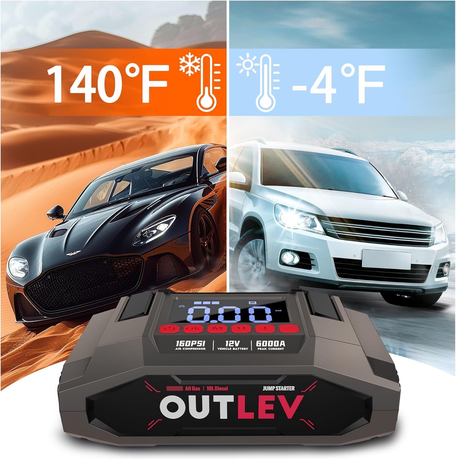 ADVANCED SAFETY & DURABLE DESIGN (10-LAYER PROTECTION): Jump starter with total confidence. OUTLEV safeguards prevent sparking, reverse polarity, over-current, over-voltage, short-circuit and more. Heavy-duty smart clamps and honeycomb thermal management reduce heat by 30%, extending lifespan and ensuring safety.