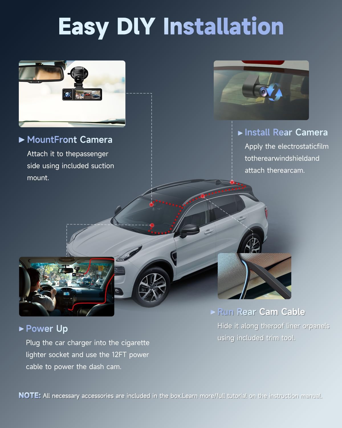 【4k Dashcam With 24H Parking Mode】The device requires hardwire kit (ASIN: B0D98CC7L8, sold separately). The dashcam automatically activates parking mode when the vehicle is stationary. It detects collisions through impact or motion sensing. The time-lapse recording feature ensures continuous recording with minimal power consumption and a reduced frame rate, ensuring comprehensive 24/7 security.