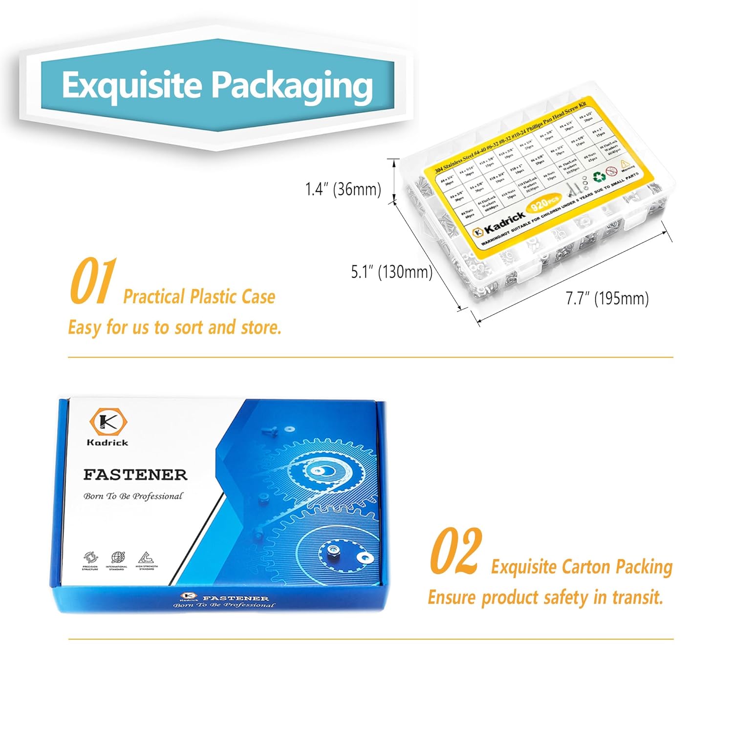 The Kadrick Stainless Steel Screws 920Pcs Machine Screw Assortment arrived in good condition and very well packaged. The case is of a pliable plastic and has two latches. It’s a good assortment, however, I felt the lock washers appear rather minuscule and I could have used some 8×3/8 screws. Other than that it’s a good mix of screws, nuts and flat washers. I supplemented the lock washers with the Jerrep 555Pcs External Tooth Lock Washer Assortment which I also give five stars.