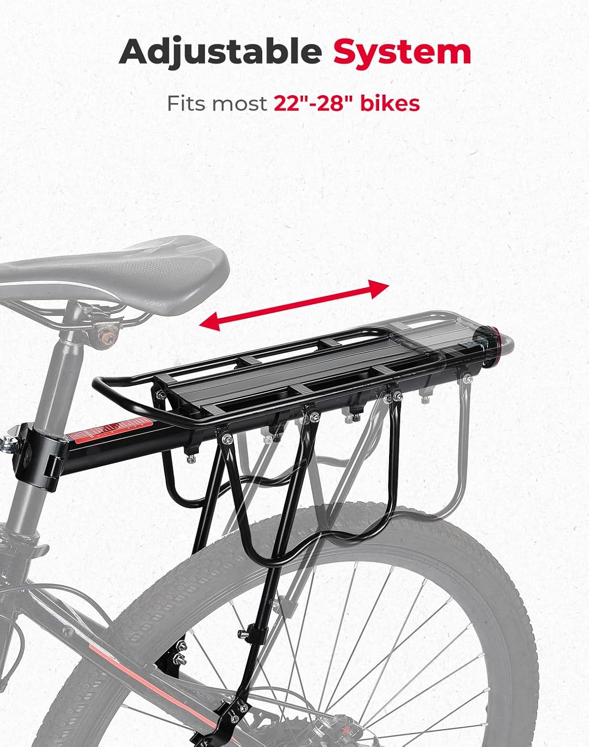 Added Bungee Cord & Tail Light : The bike cargo rack comes with a red rear reflector light and a 23.6-inch (60cm) bungee cord for added safety during night rides and increased stability while carrying items
