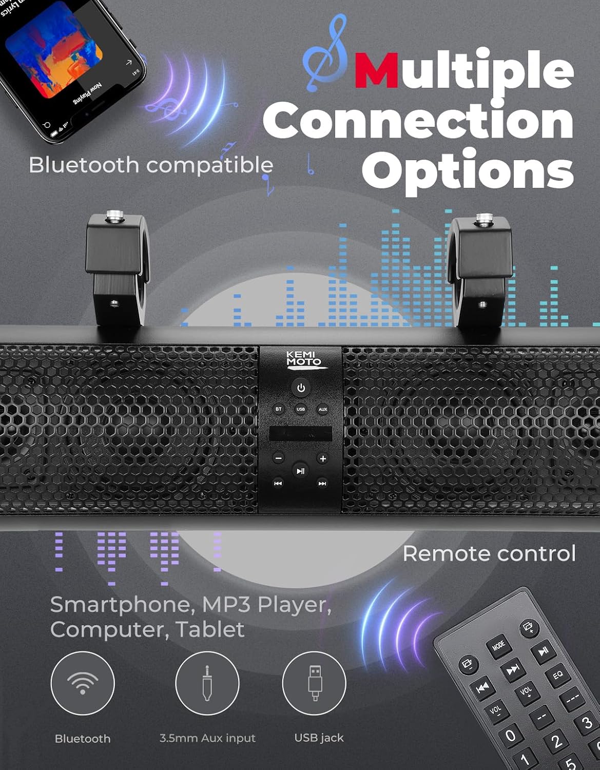Waterproof & Dustproof: The KEMIMOTO SXS Sound Bar meets the IP65 Rating International Standard, ensuring complete protection against dust, oil, and other non-corrosive materials. It also provides a good level of protection against water. Powerful Loud and Clear Sound: Equipped with two 4” full-range speakers and two 1” soft dome tweeters, the KEMIMOTO sound bar is powered by a high-performance 400W to provide you a loud music even during riding.