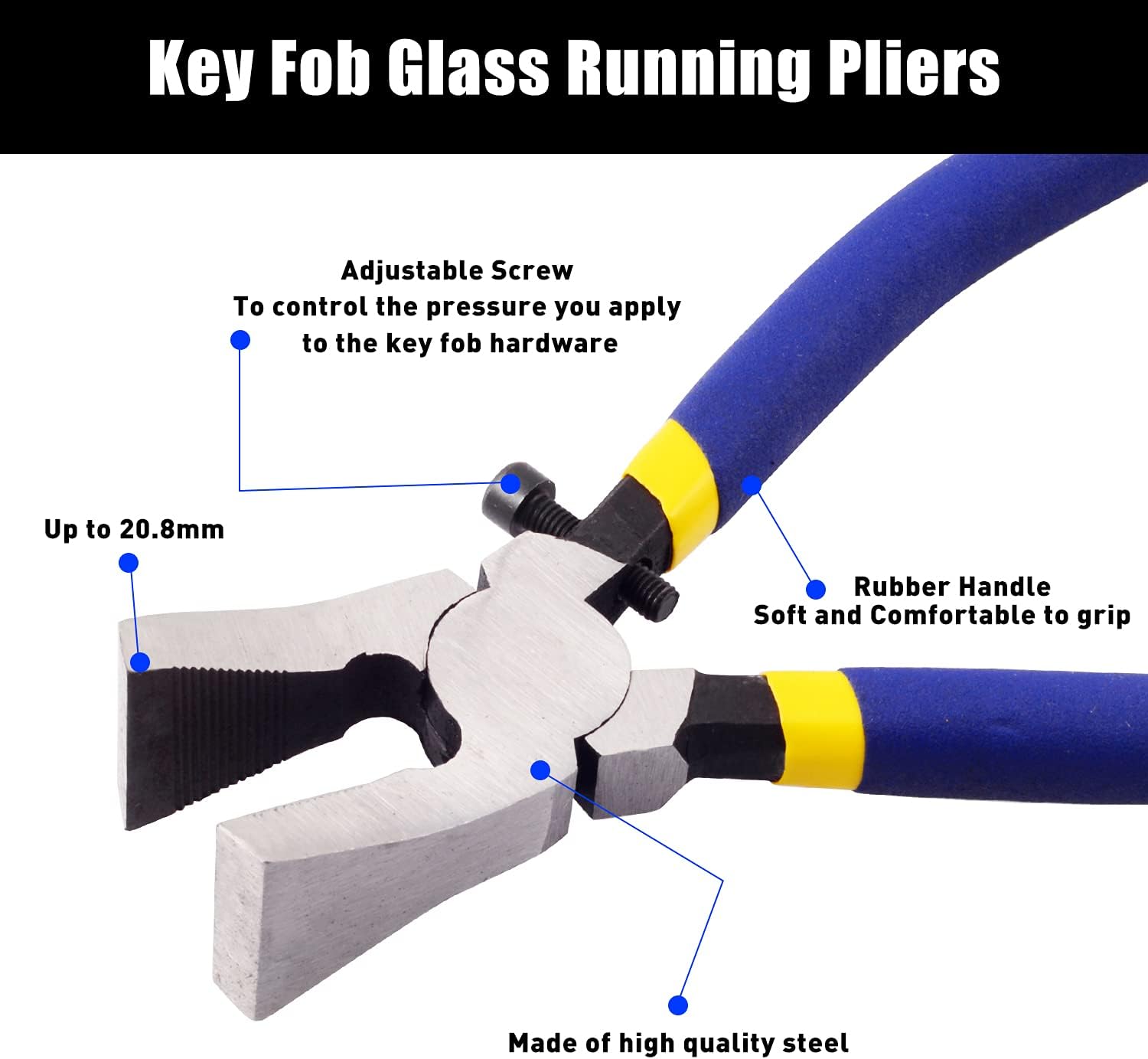 {Key Fob Pliers With Adjustable Set Screw} Comfortable Premium Grips to Help Secure Glass, jaws apply leverage to run the score reducing hand fatigue. Glass Running Pliers Adjustable set screw allows you to control the amount of pressure applied, set screw is easy to adjust, and properly tapped; you can use them on different thicknesses of glass.
