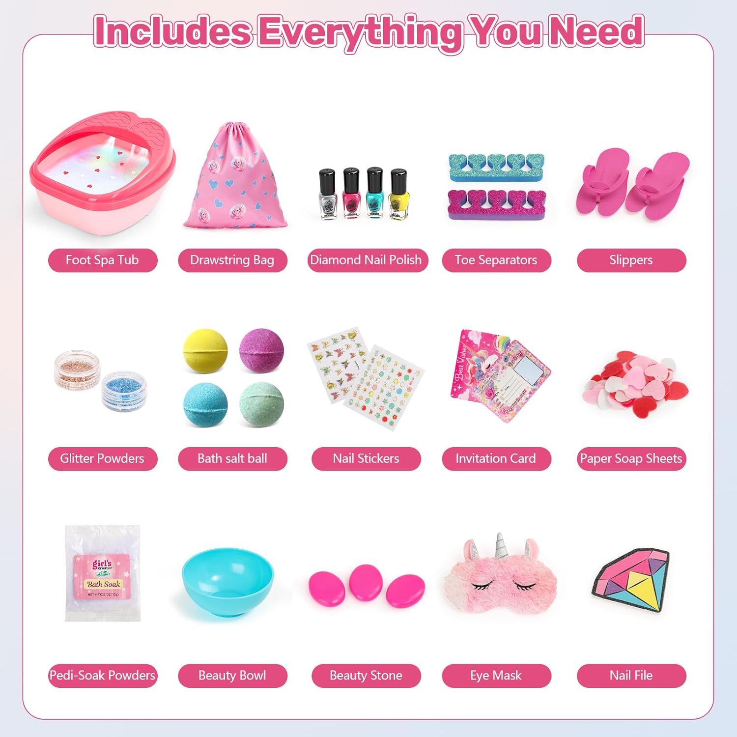 Kids Foot Spa with Nail Kit for Girls 4-12, All-in-1 Kids Pedicure Foot Spa Day Salon Toy Kit with Colorful Lights & Nail Art, Party Birthday for Girls