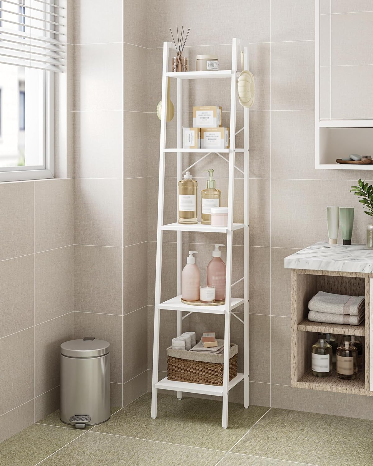 Ladder Shelf, Bookshelf Bookcase, Freestanding Corner Storage Shelve with 2 Hooks for Home Office, Living Room, Kitchen, Bedroom, Industrial, 5-Tier White BC03213W