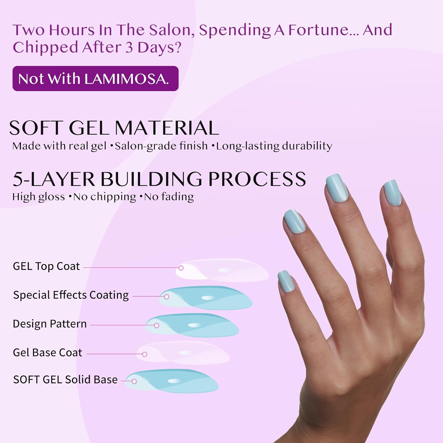 This design features a solid ash-gray blue shade. Crafted with layered real soft gel, just like in a salon, and finished with a UV top coat for a glossy, chip-resistant look that won’t fade or split.