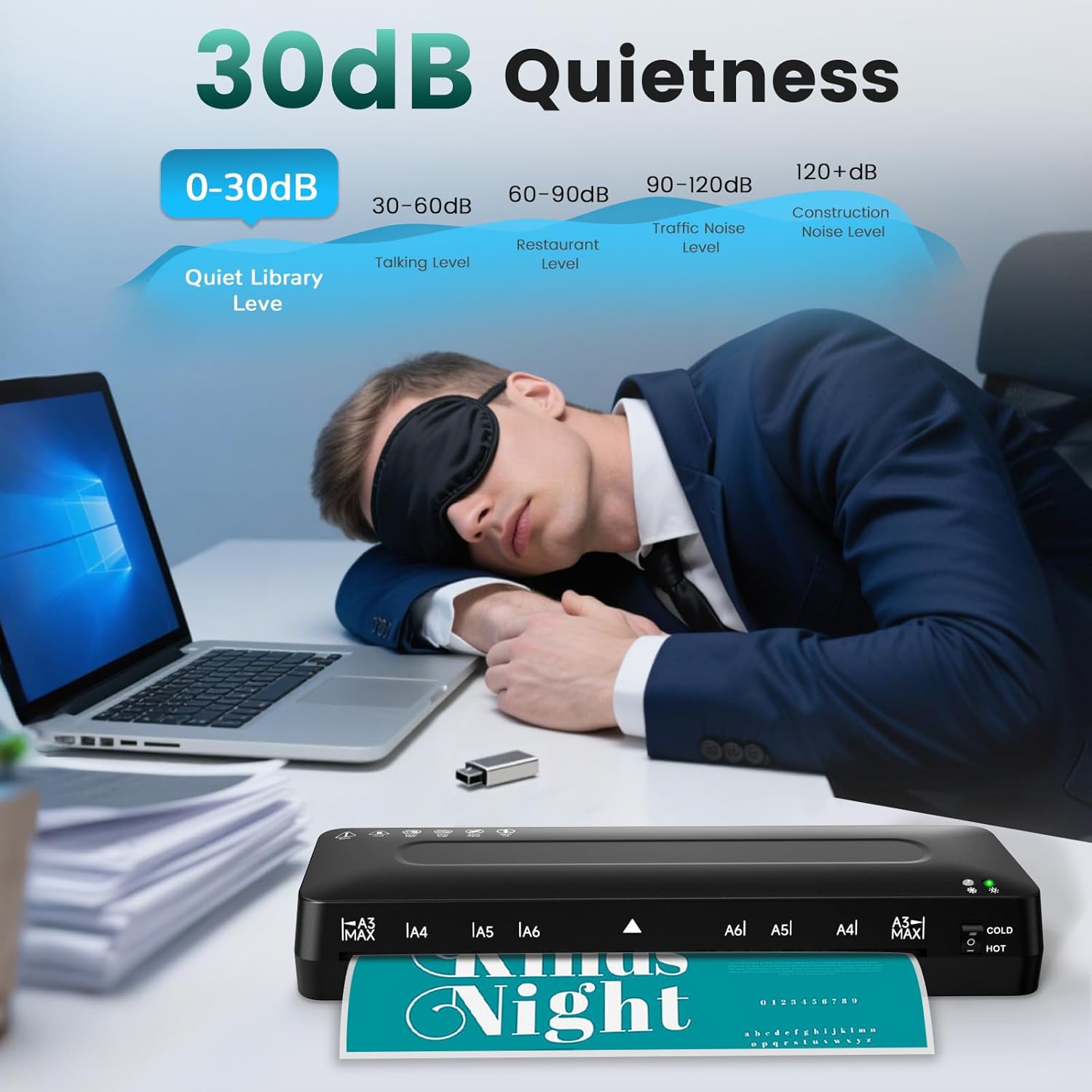 Quiet Operation and Intelligent Safety: Equipped with an advanced temperature control system, this laminator machine with laminating sheets operates at less than 55db, providing a quiet working environment. Ideal for teachers and anyone in need of a personal laminator, it offers a safe, efficient lamination process, extending the lifespan of the machine while maintaining high-quality results