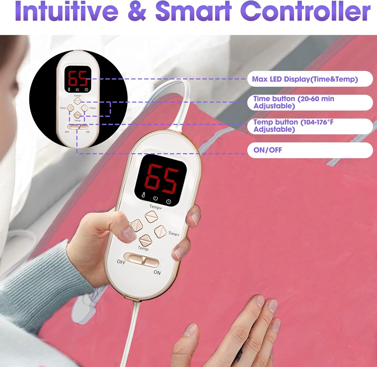 Large screen display remote: Jkiui sauna blanket comes with a upgraded large screen display remote, you can see real temperature and time on the screen in use.