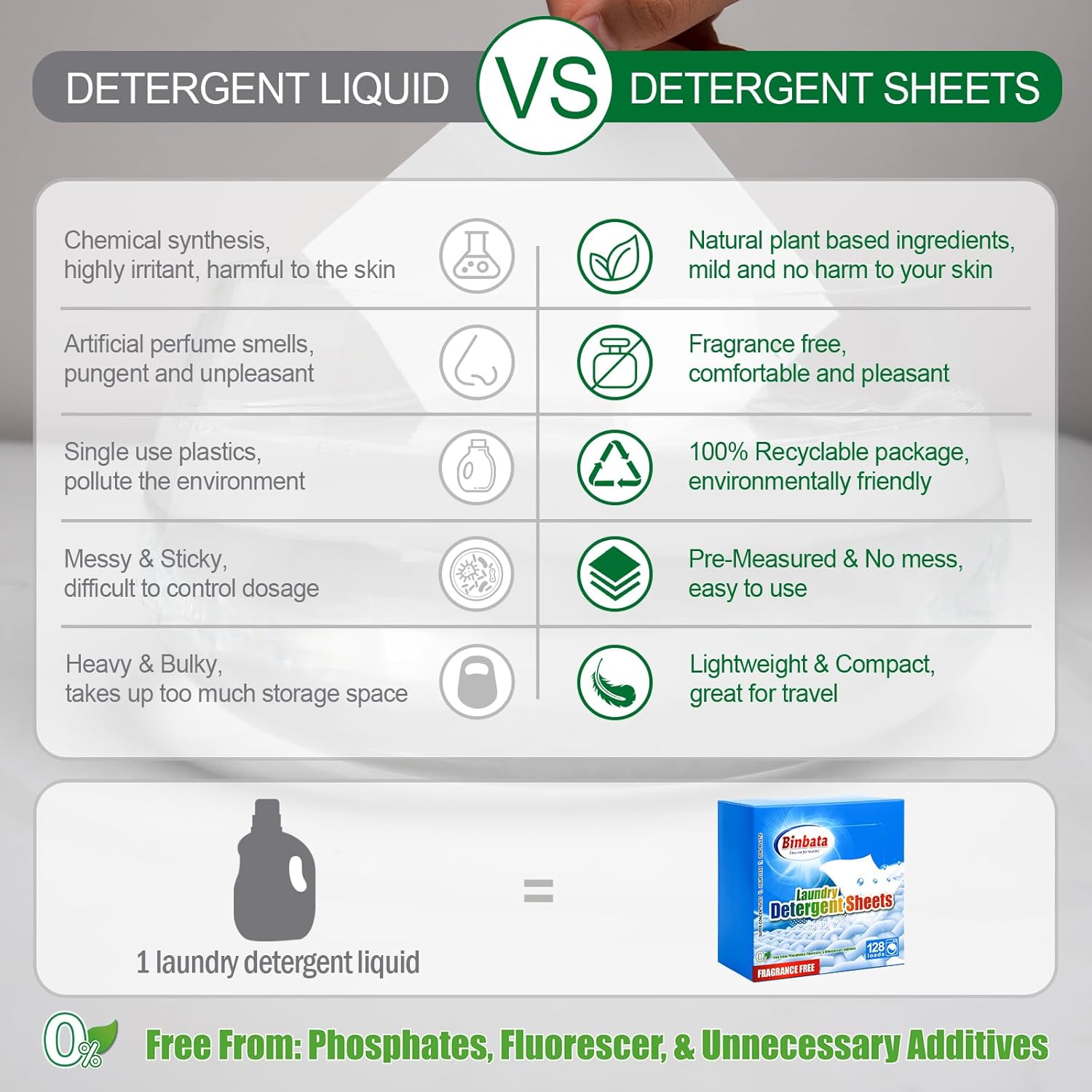 𝐙𝐞𝐫𝐨 𝐖𝐚𝐬𝐭𝐞 & 𝐍𝐨 𝐏𝐥𝐚𝐬𝐭𝐢𝐜: Compared to traditional liquid and powder detergent, Binbata eco laundry detergent sheets adopt plastic-free, zero waste recyclable package, reduces 95% fuel consumption and carbon emissions during the transportation, has and will always work hard to alleviate global warming.