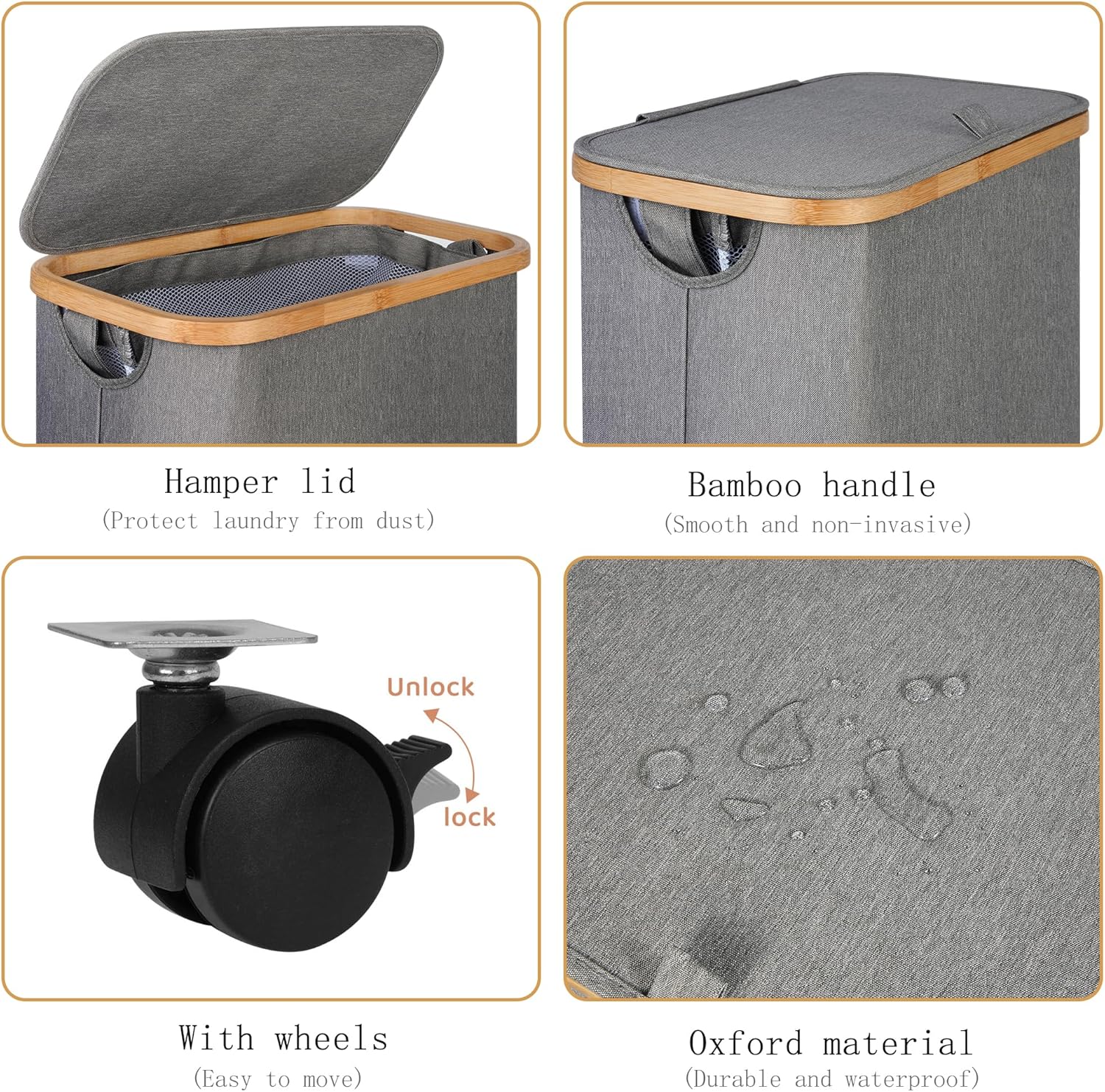 【Robust Construction & Premium Materials】 A bamboo top frame combined with corner support rods provides the clothes hamper with a sturdy foundation. The basket is made of high quality Oxford cloth which protects the clothes from moisture.