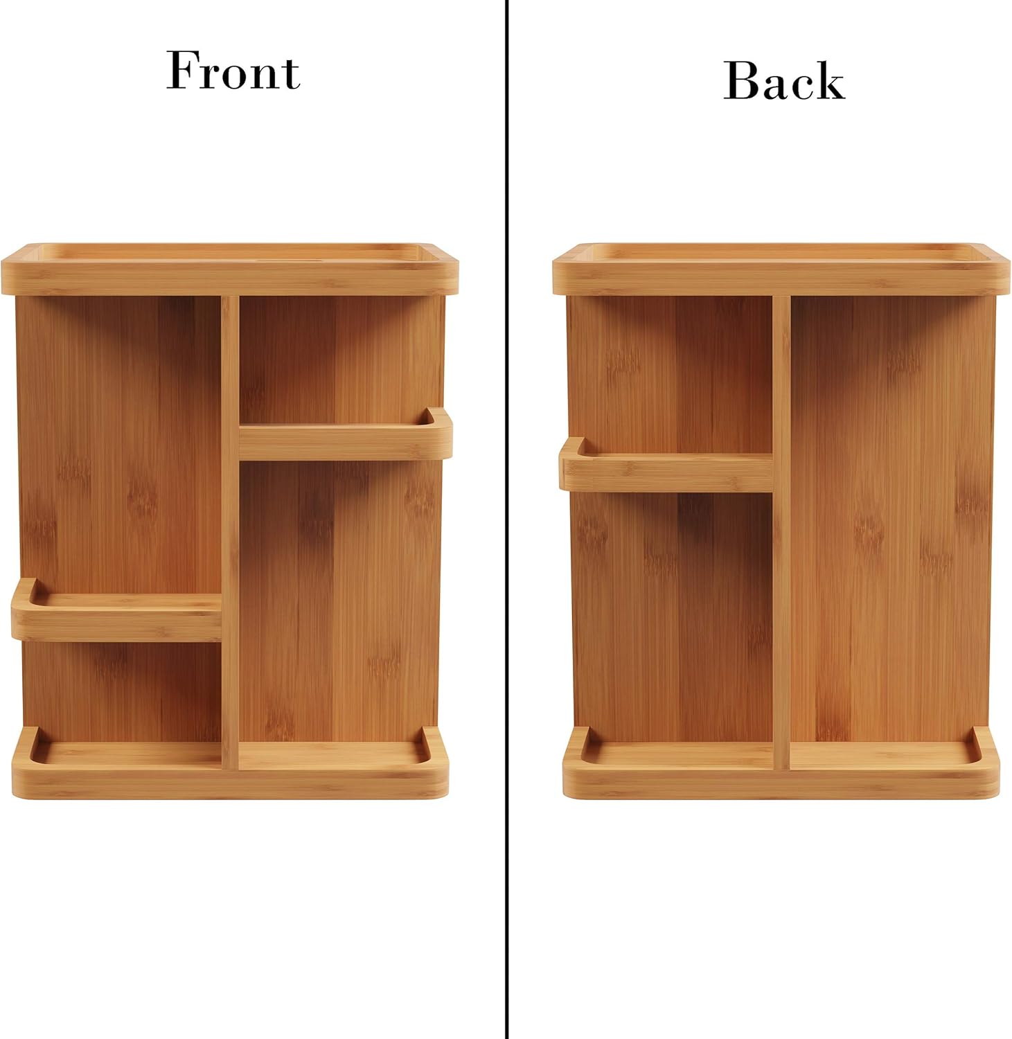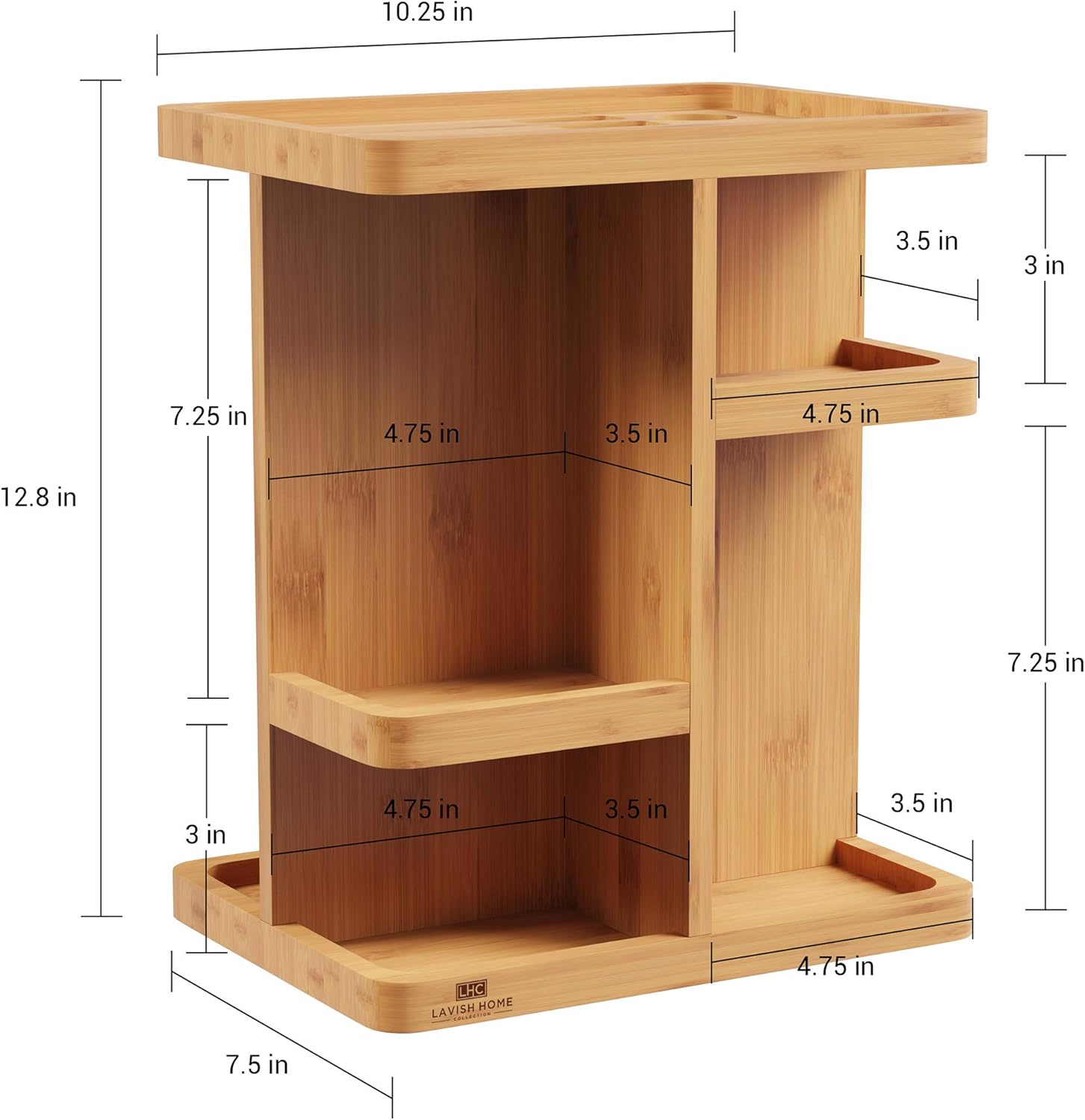 PRODUCT DETAILS – Materials: Bamboo. Dimensions: (L) 10.25″ x (W) 7.5″ x (H) 12.8″; XL Shelf: (L) 4.75″ x (W) 3.5″ x (H) 11″; Large Shelves: (L) 4.75″ x (W) 3.5″ x (H) 7.25″; Medium Shelf: (L) 4.75″ x (W) 3.5″ x (H) 6.5″. Color: Natural Finish.