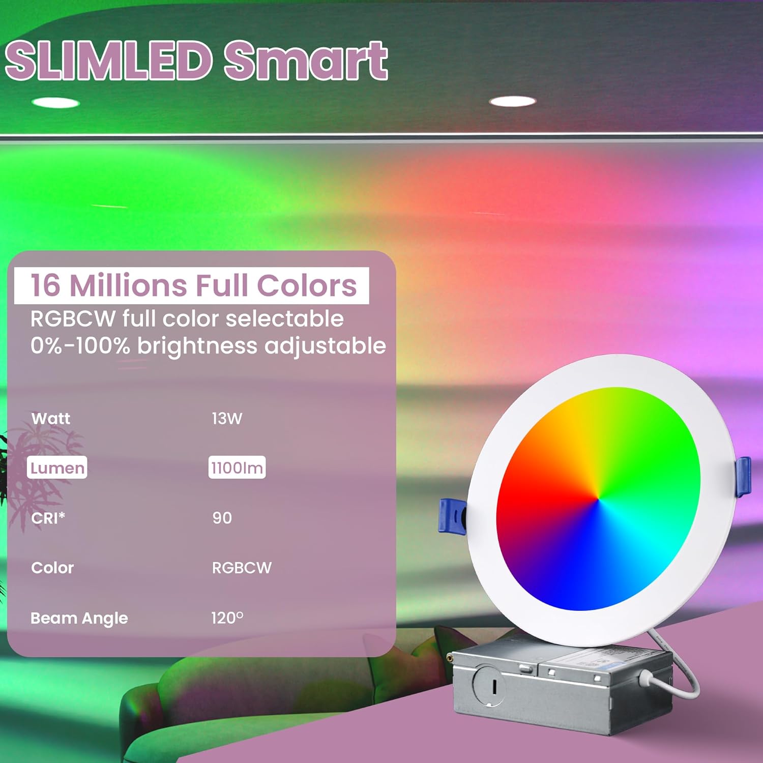 LED Recessed Lighting 6 Inch – 96 LED 5CCT 2700K–6500K Canless Wafer Downlight 16M Colors, Music Sync, Smart App & Voice Control, 1100 Lumens Dimmable RGBCW, Timer for Home & Kitchen – 6 Pack