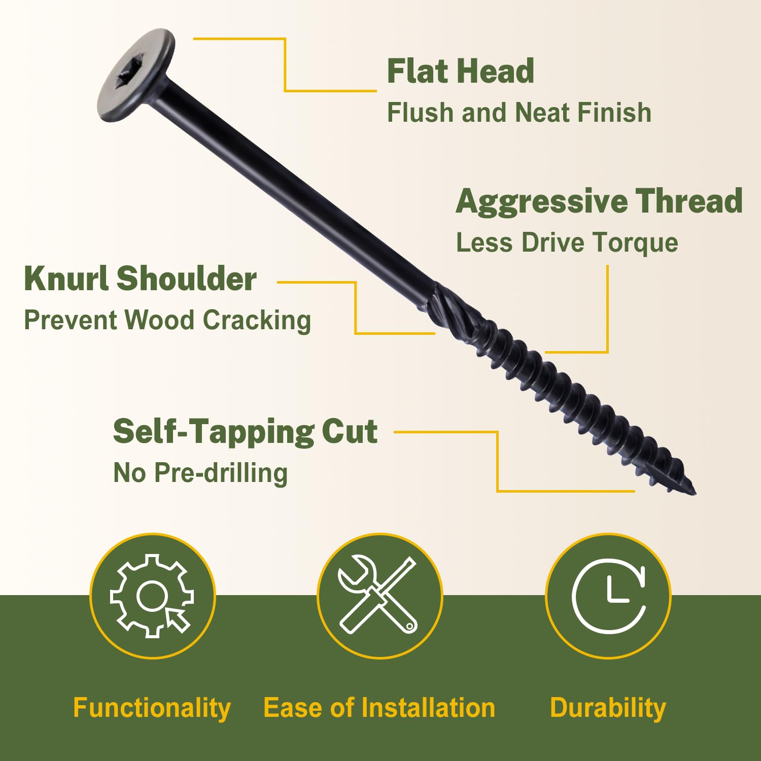 EASY TO INSTALL: The knurled shank and sharp threads of our structural screws greatly reduce drill torque requirements, ensuring easy drilling into wood without causing any damage. The type 17 notched extra sharp point makes pre-drilling unnecessary