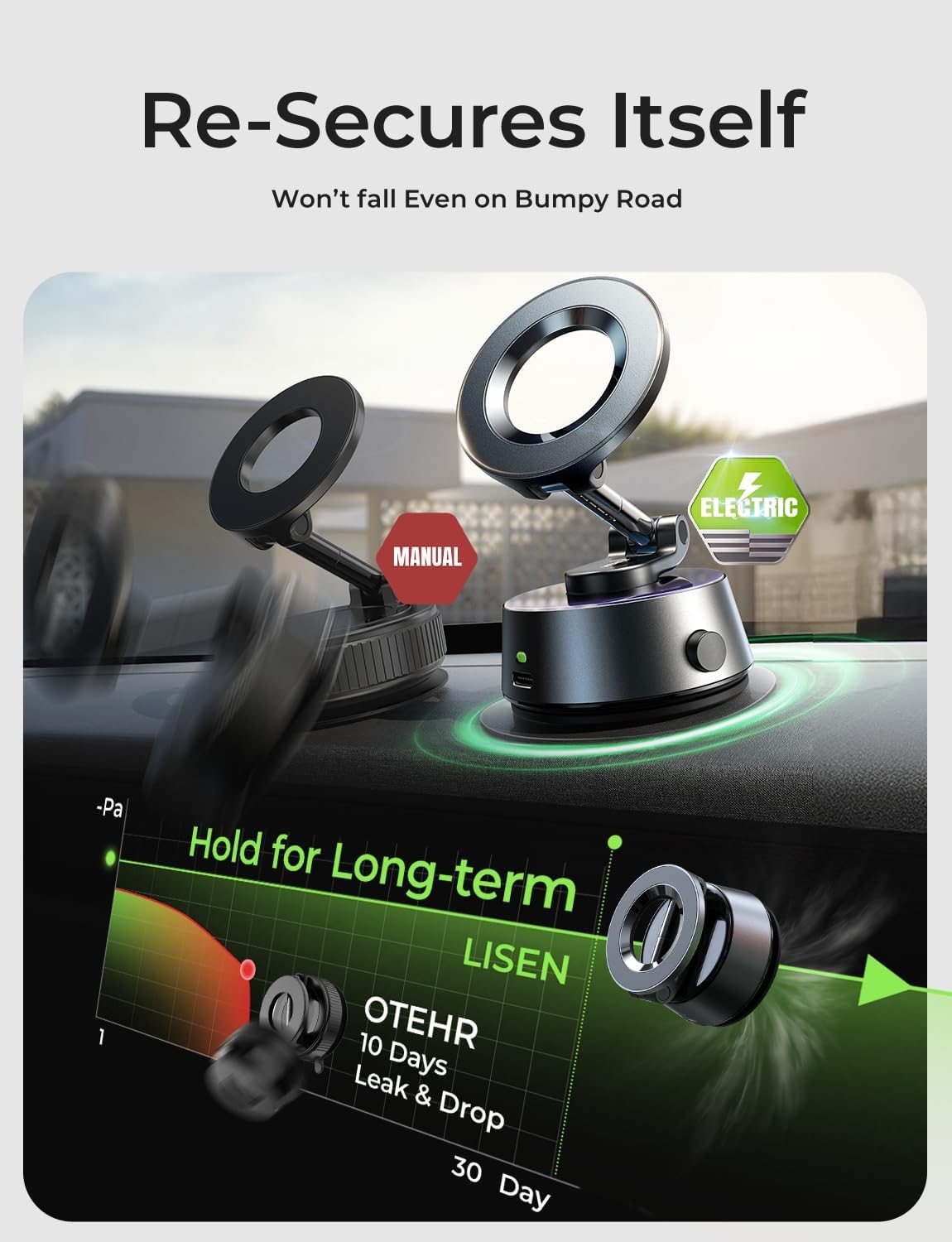 The LISEN MagSafe Mount uses a clever little vacuum pump to lock onto your dash like itâs holding onto dear life. Itâs sleek, rock-solid and makes you wonder why every mount doesnât work like this.â Pros:- Electric vacuum suction = set it and forget it- MagSafe grip is super strong- 360° rotation and adjustable angles for the perfect view- Works with iPhones and Androids (magnetic ring included)- Decent battery lifeâ Cons:- Doesnât charge your phone, just holds it (no power delivery)- On the pricier side for a non-charging mount- More for temporary holding scenarios rather than long term mounting