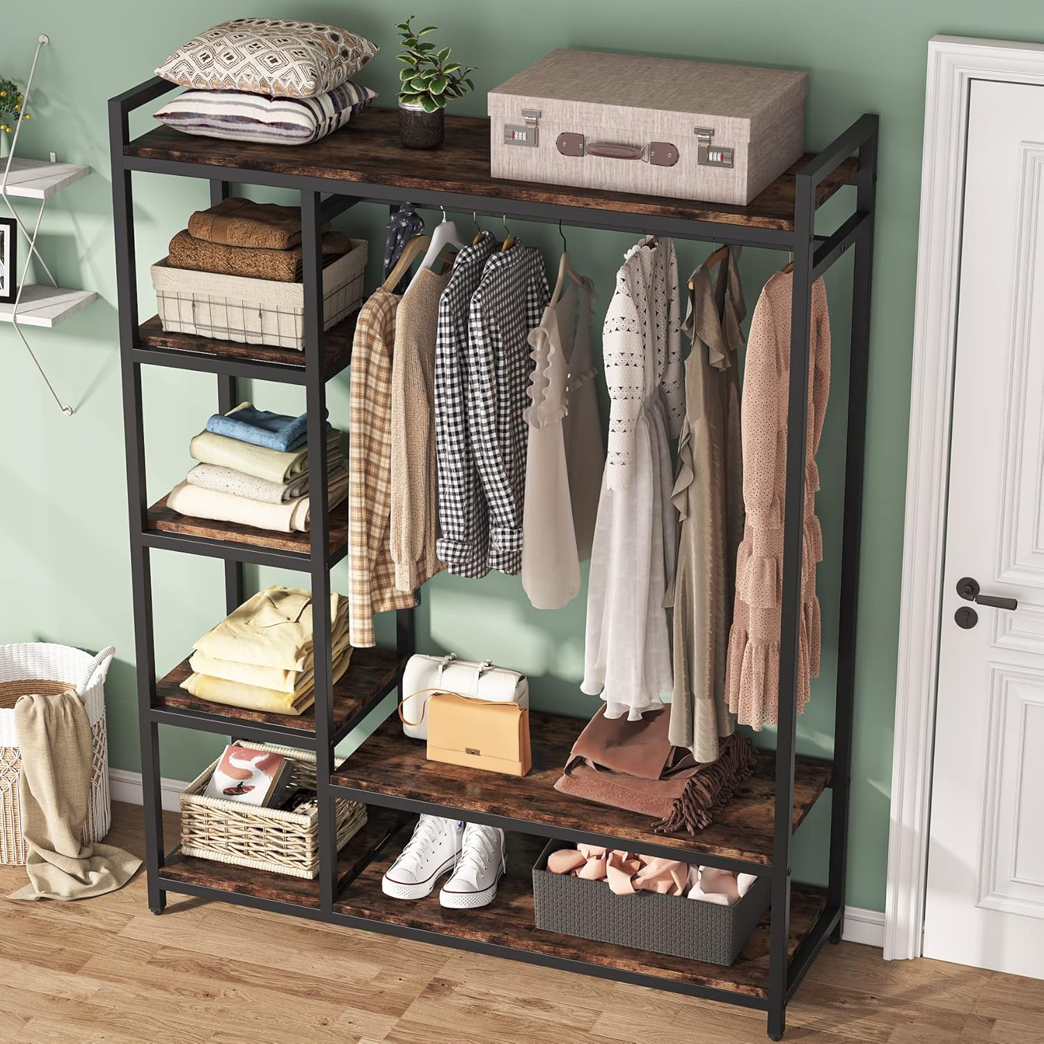 Ample Storage Space: With 2 large shelves, 4 small shelves, and garment rods that can hold up to 50 lb, you’ll have plenty of room to store clothes, shoes, accessories, and more. Plus, the top of the organizer can hold large boxes for even more storage.