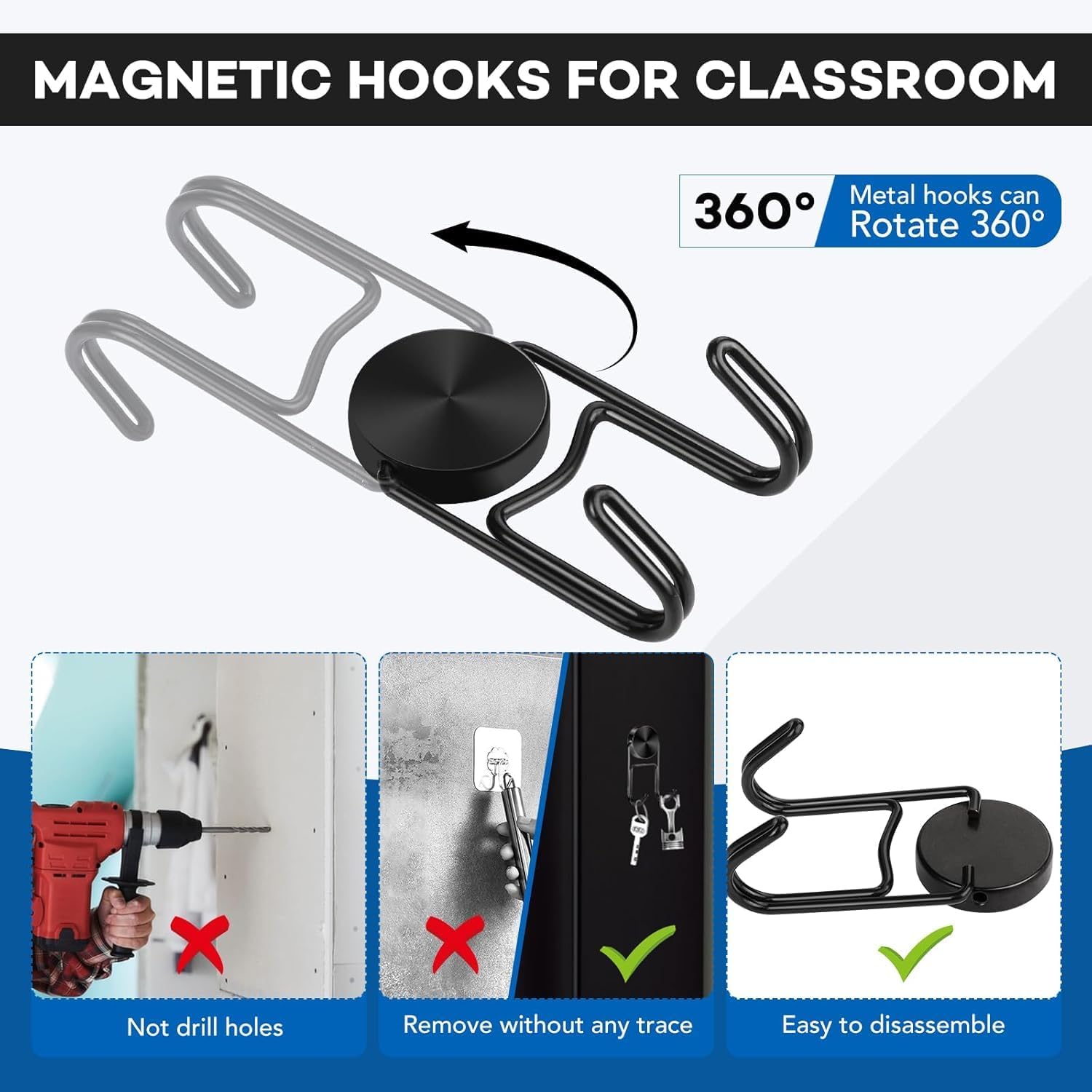 【 Original Design 】 The hook magnets have a design patent, developed and produced by our own factory. The metal magnetic hooks are beautiful and practical,does not require drilling, and can be rotated and disassembled freely. It has 2 hooks, doubled storage capacity, and can hang things without holes.