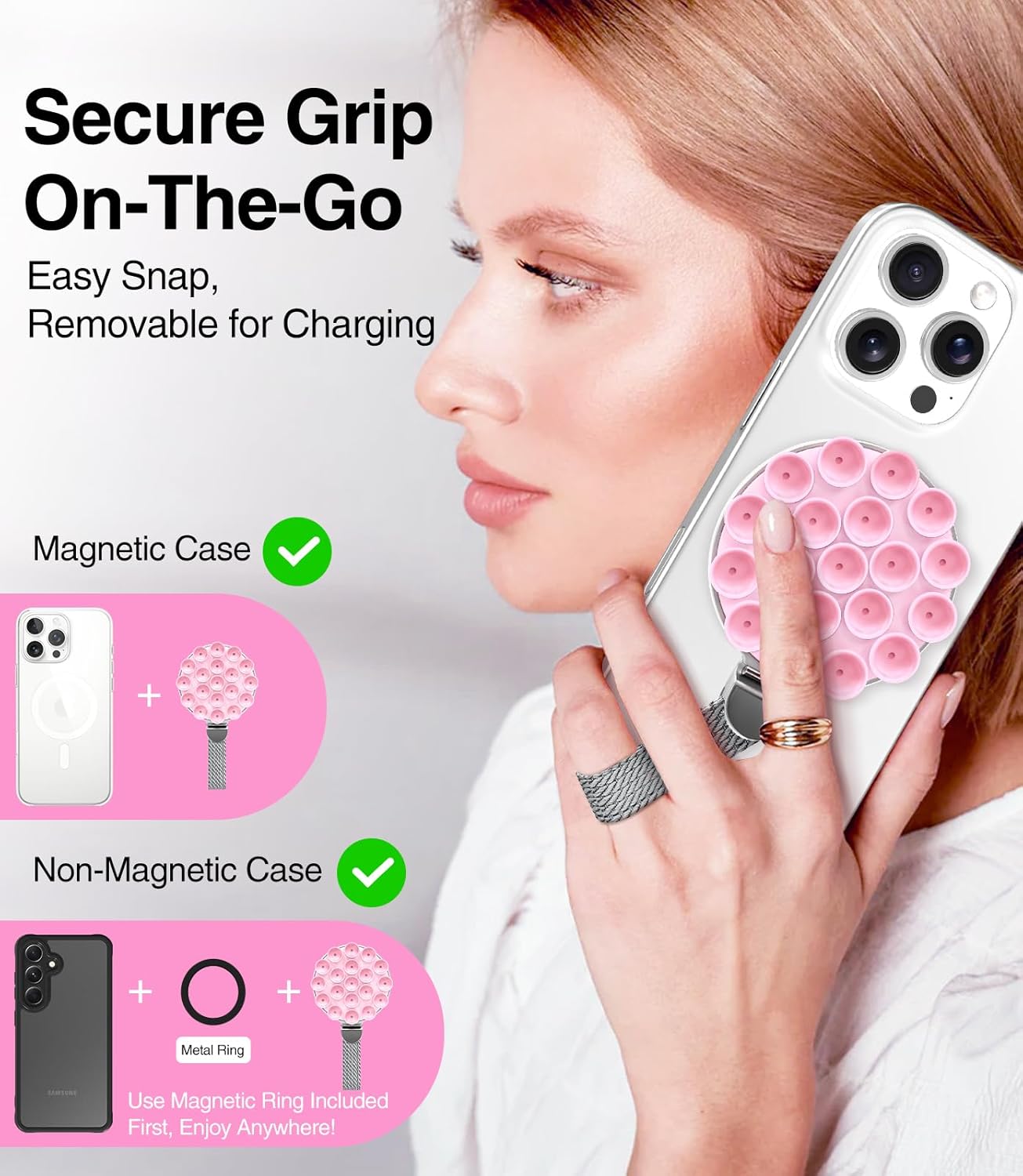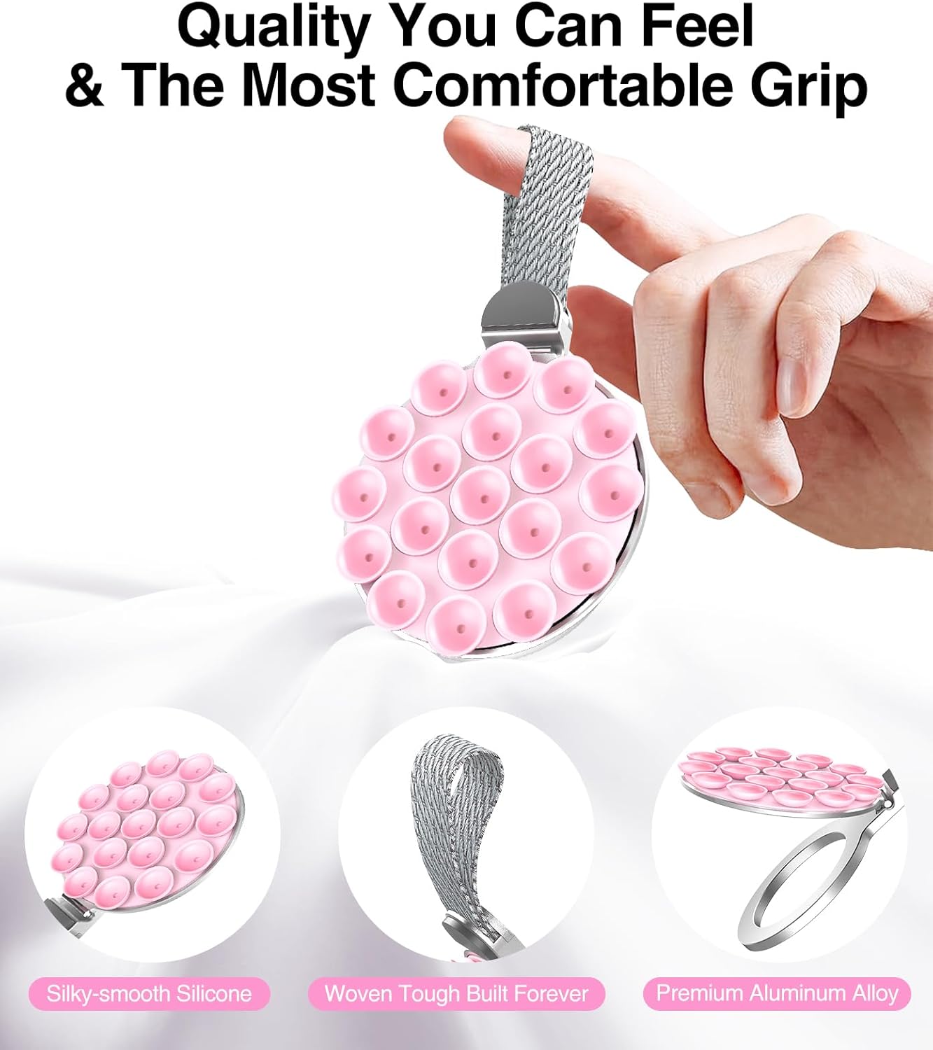 MagSuction Grip Magnetic Phone Grip Holder for MagSafe, Silicone Suction Phone Mount, Adjustable Kickstand with Finger Loop, Compatible with iPhone 17/16/15/14/13/12 Series (Silver&Pink)
