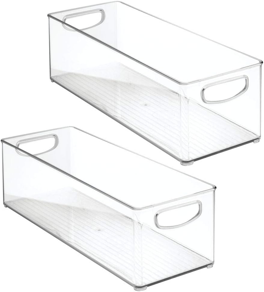 PORTABLE & STACKABLE: Built-in handles make it easy to move this bathroom bin organizer on and off shelves and around the home; Perfect for bathroom shelves, under-sink cabinets, cupboards, and closets; Open tops and clear construction make it easy to see what is stored inside and quickly grab what you need; Non-skid feet allow bins to stack and take advantage of vertical storage space; Use multiple to create a storage system that works best for you