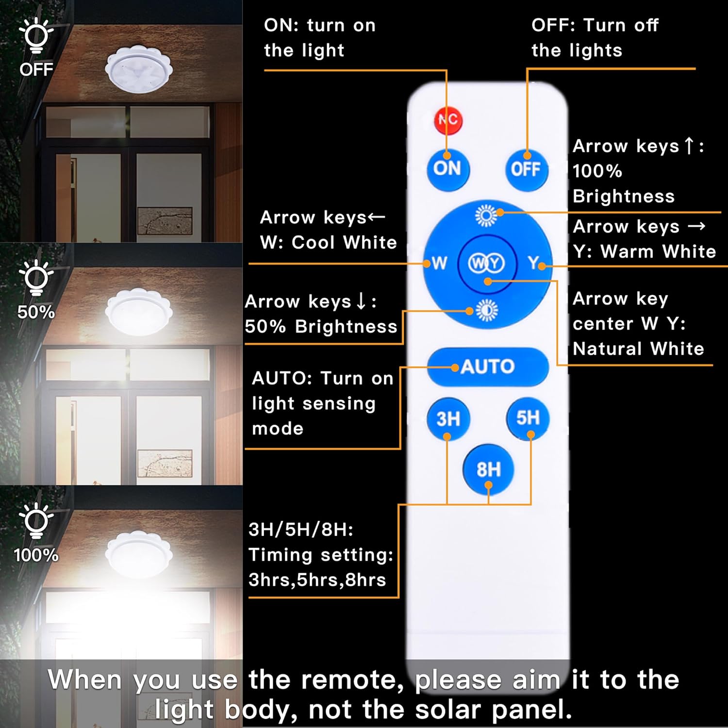 ★★【Remote】: When you use the remote,please aim it to the light body,not the solar panel.