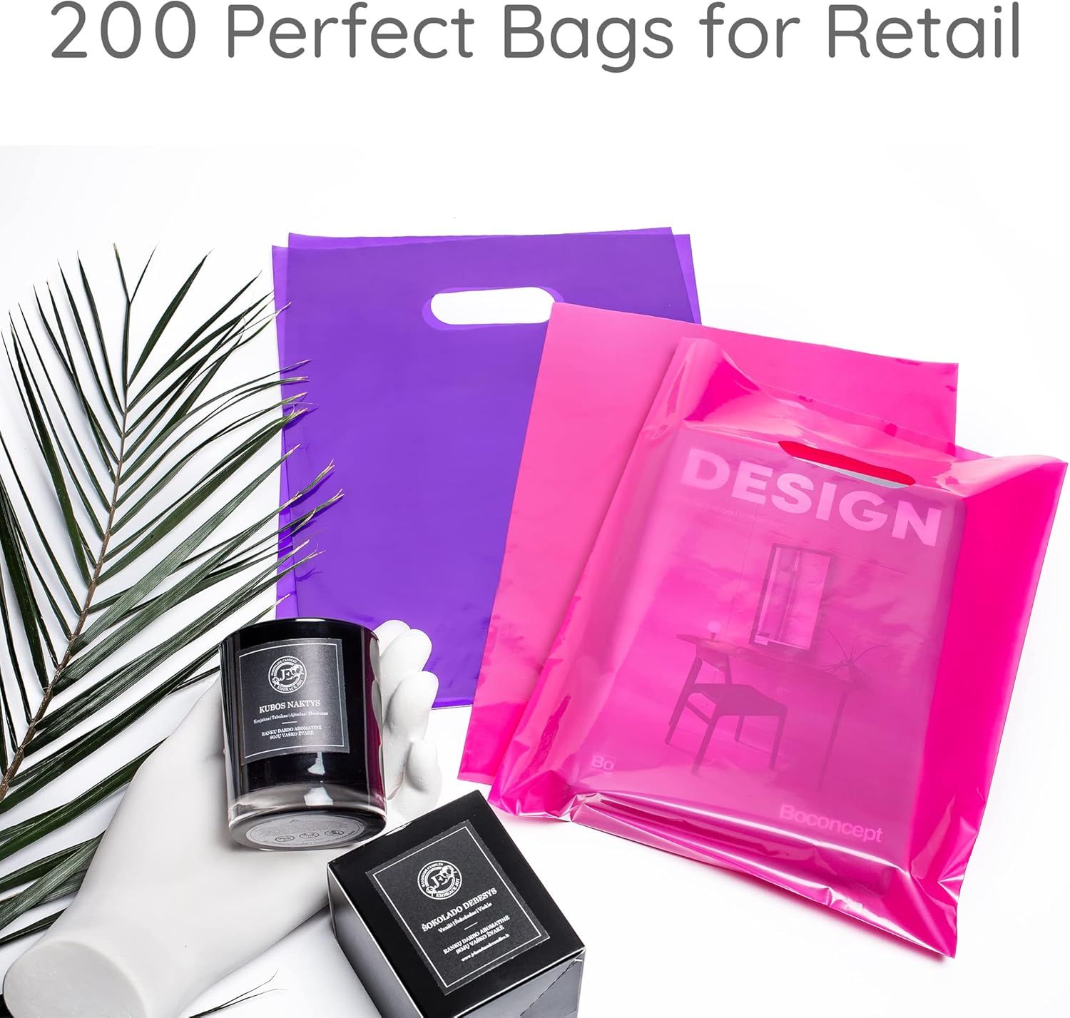 VALUE PACK – 200 Bags per pack – 100 Pink and 100 Purple merchandise bags 9″ x 12″ with a glossy finish and Die-cut handles for convenience.