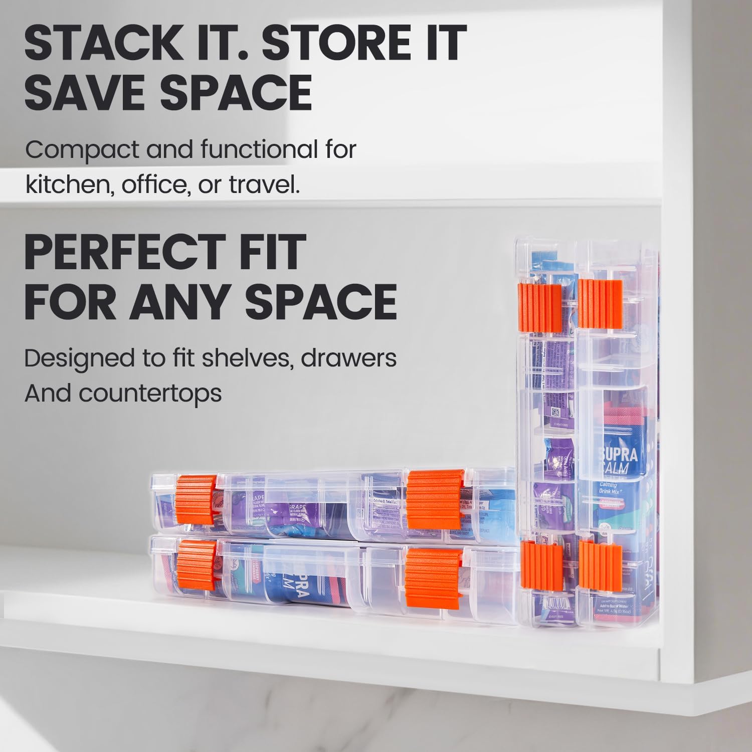 STACKABLE: Designed to stack and save space. This drink mix organizer keep your flavored water packets neatly organized and within reach. perfect for cabinets, countertops, or anywhere you need tidy storage
