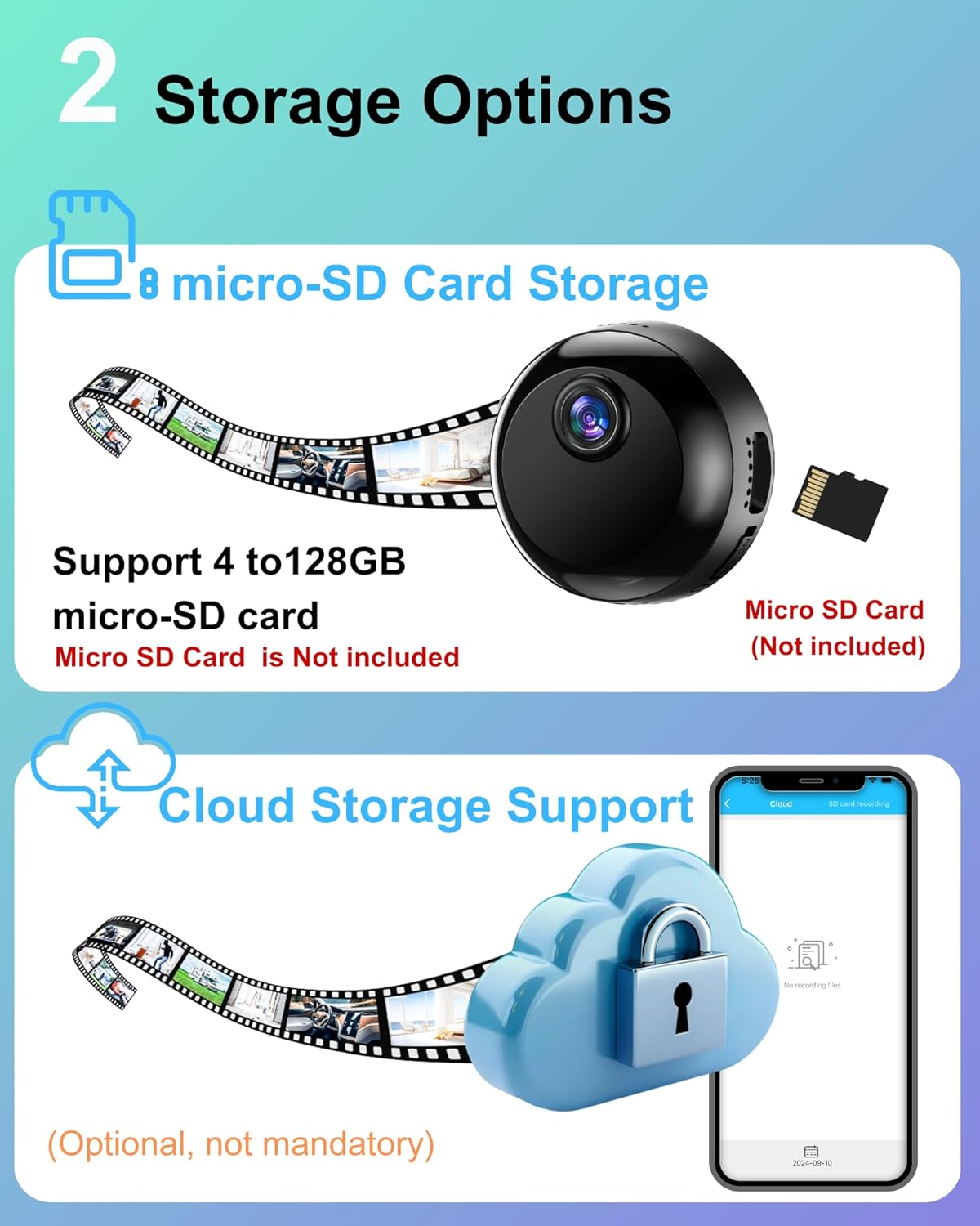 【2 Storage Options】: This wifi camera supports record and save videos to micro-SD card or Cloud storage. It supports 4-128GB micro-SD card(Not included). Cloud storage is optional for safe backup, not mandatory.