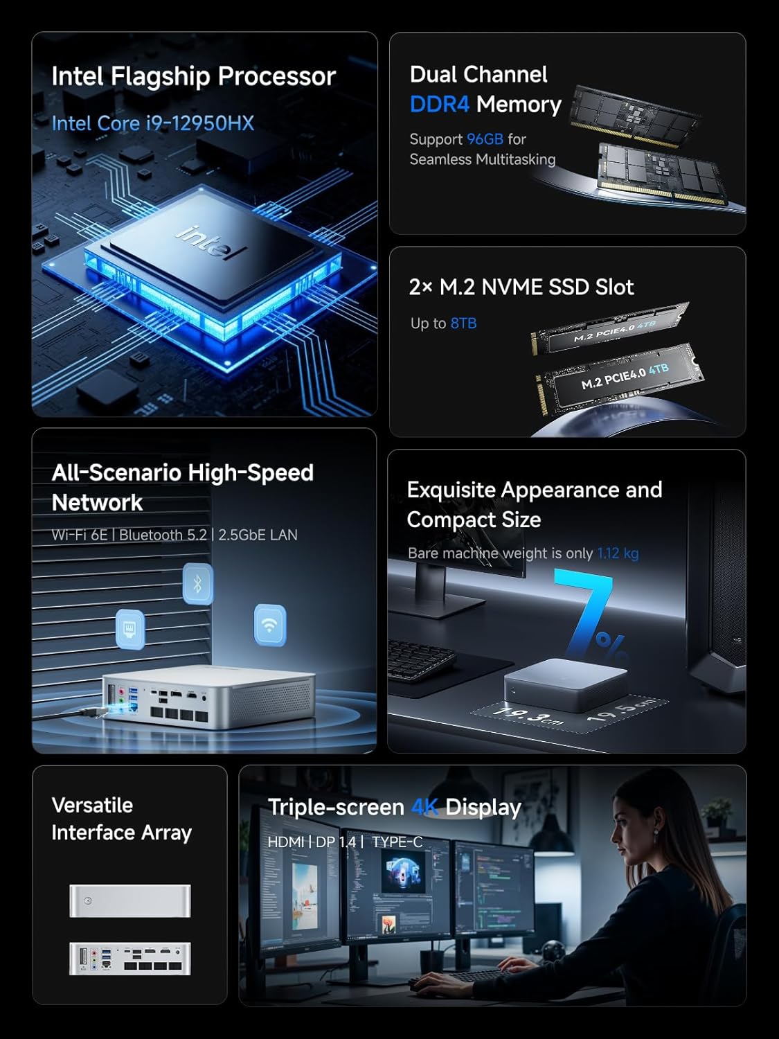 【Mini PC for Office Home】The M1-1295 Mini PC is powered by an Intel Core i9-12950HX processor, featuring 16 cores, 24 threads, up to 5.0GHz, 30MB smart cache, and features an advanced hybrid architecture with 8-performance cores and 8-energy efficiency cores, offering strong multi-core performance and high-frequency advantages. Let you feel the flagship level silky smooth switching in every operation.