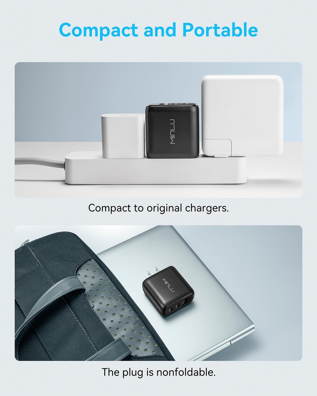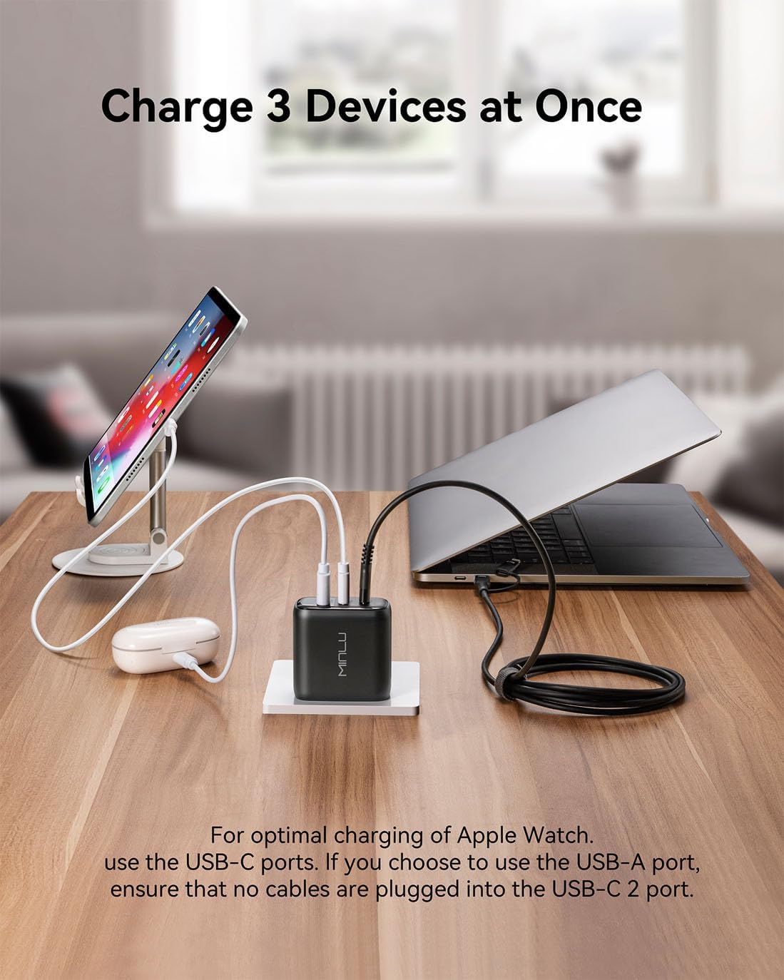 The MINLU 65W USB C Charger Block is an absolute powerhouse in a compact size! It charges my MacBook Pro, iPhone 15 and my office PC quickly and efficiently, all at the same time thanks to the 3-port design. The GaN tech keeps it cool and efficient, and I love that it comes with a high-quality 6ft 2-in-1 USB-C/L cable, which is super convenient for switching between devices. It’s perfect for travel or daily use, and I couldn’t ask for a more reliable fast charger! Great product.