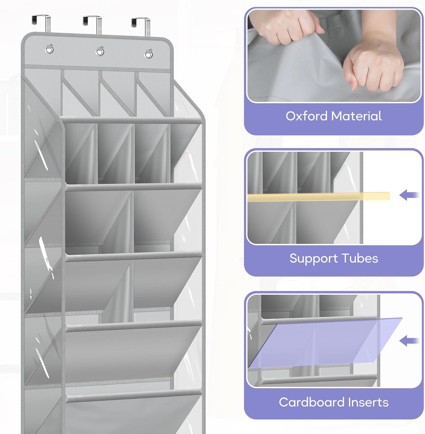 High Quality: It’s made of tear-resistant oxford fabric with cardboard inserts and support tubes, thick metal hooks can hold up to 50 pounds. Which makes the shoe organizer door hanger solid