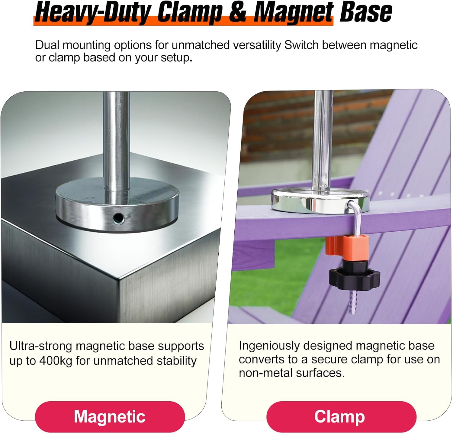 【All-in-One Base, Fast Setup】Our custom-engineered one-piece base supports both magnetic and clamp mounting. Easily attaches to metal or non-metal surfaces—no tools, no hassle, just quick and stable setup anywhere. .