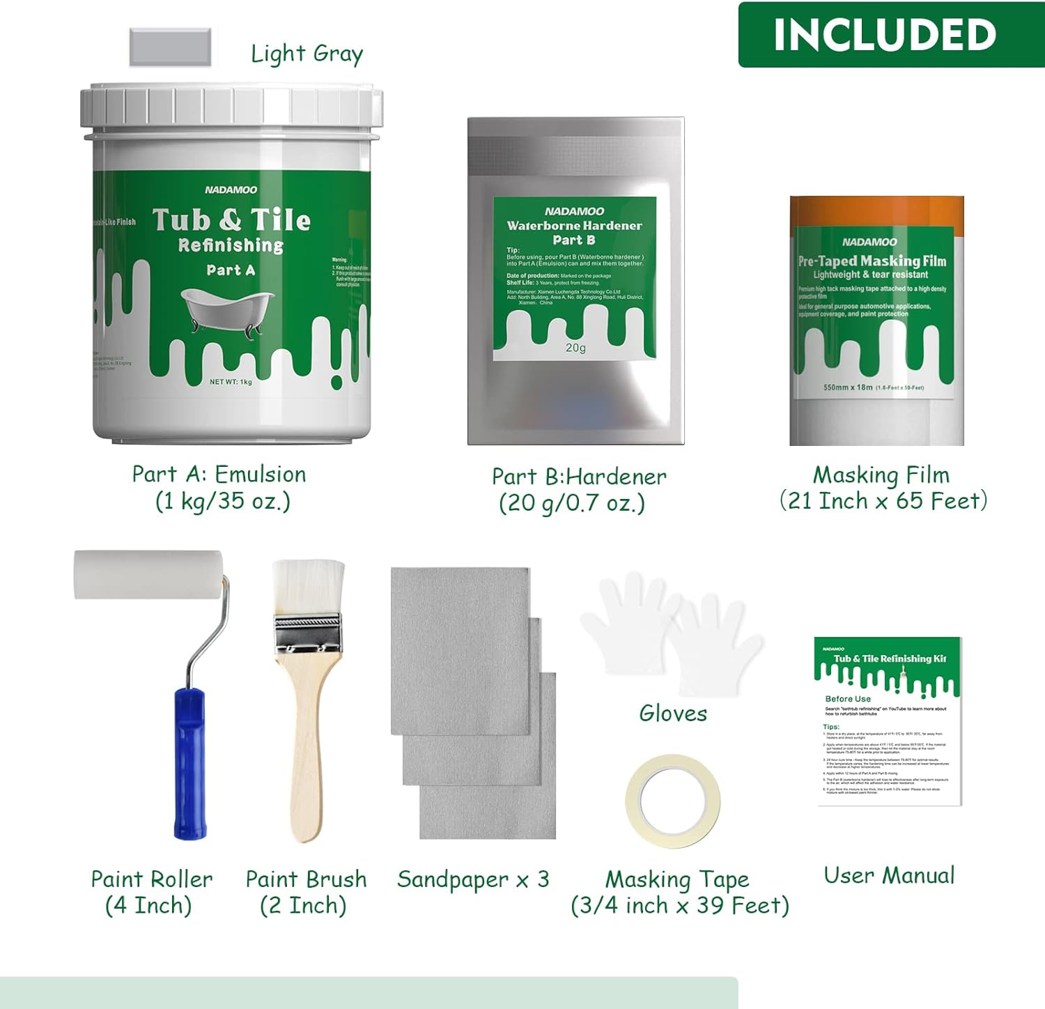 Included: compound emulsion 1kg/35 oz(part A), Hardener 20g/0.7 oz (part B), user manual, gloves, brush, roller, pre-taped masking film , masking tape ,sandpapers. We proudly provide you all items that allows you to bring you refinishing projects to life with no unnecessary stress!